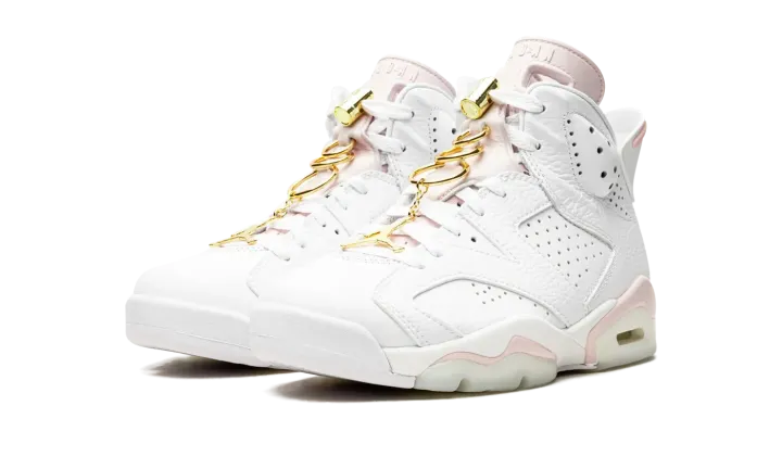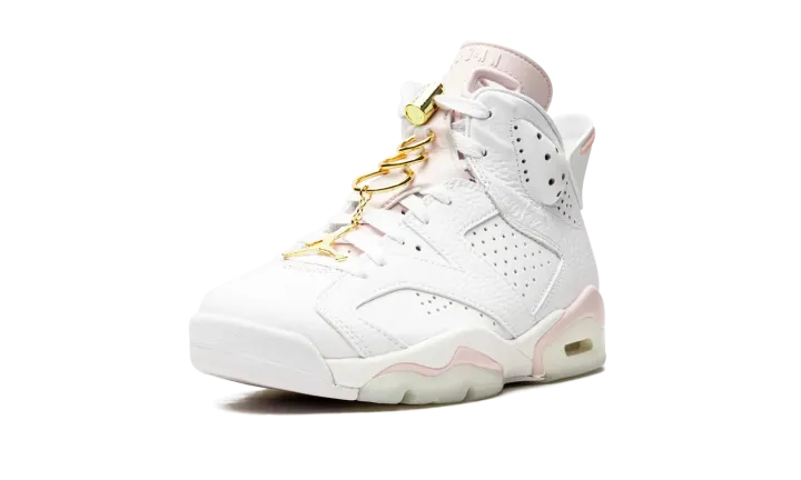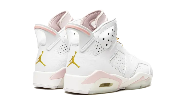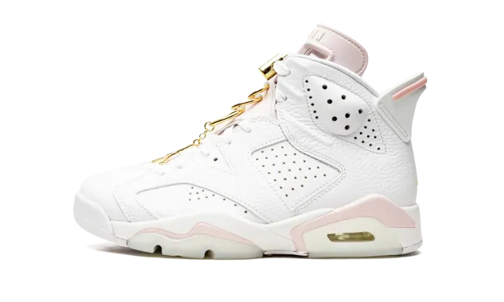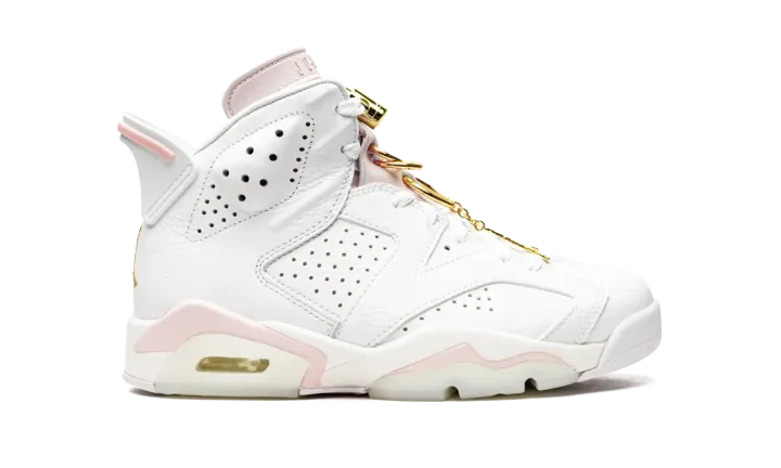 The Women's Air Jordan 6 "Gold Hoops" is a women's-only colorway of Michael Jordan's sixth signature shoe that excels in versatility due to its neutral design. Ideal for the summer months, the "Gold Hoops" displays luxurious gold accenting on various points of its design, specifically on the Jumpman-branded lace toggle, on the spoiler, and on the gold hoop earring-inspired Jumpman hang tag. Crisp white leather overlays contrast the Sail-colored base. Gold "Jordan" detailing can be found on the top of the spoiler-like plastic tongue. A speckled, cement-like pattern highlights the look of the Sail rubber midsole. Release date: July 1, 2021.