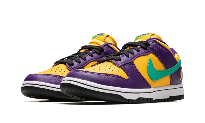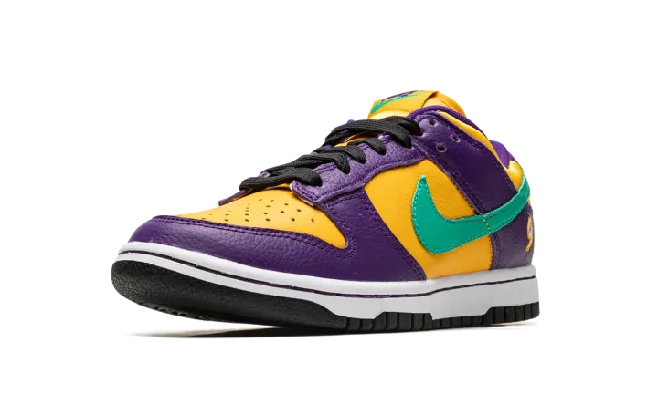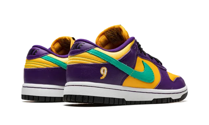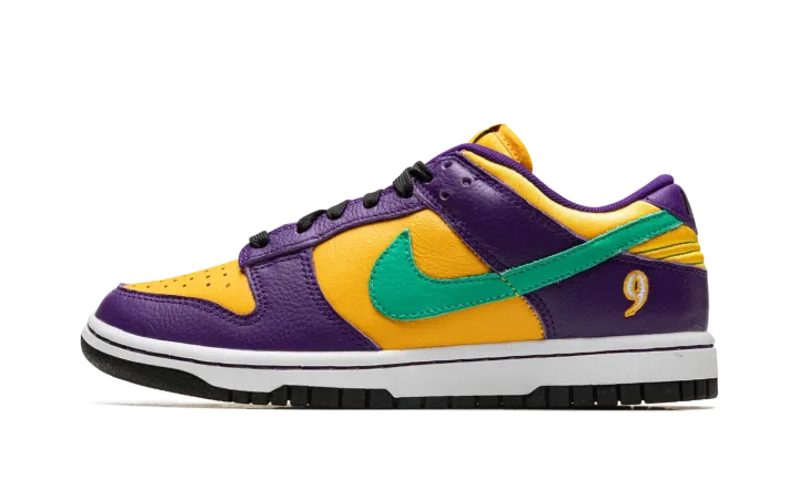 The Nike Dunk Low "Lisa Leslie" is a special edition colorway that celebrates the 20th anniversary of the legendary Los Angeles Sparks' basketball player who became the first woman to dunk in a WNBA game. Leslie, who was an original member of the Sparks and WNBA from the league's beginning in 1997, is immortalized on the Dunk by combining the Sparks' team uniform colors with her "9" jersey number on its design. Specifically, the perforated toe, mid-panel, collar, and heel are designed in yellow leather. The overlays appear in purple leather. A green leather Swoosh is found on either side. As mentioned, Leslie's "9" jersey number is embroidered on the lateral side of the heel. Classic "Nike" branding is found on both the heel and tongue tag. Release date: July 9, 2022
