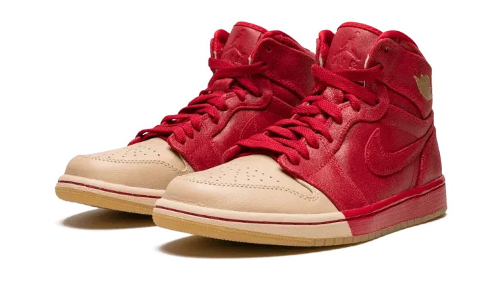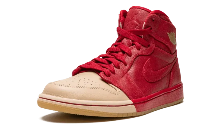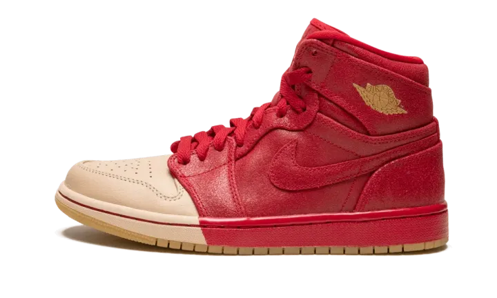 The Air Jordan 1 Retro High "Dipped Pack" offers women an unconventional take on the iconic sneaker. Sporting a color blocked theme, the red shoe comes with a toe box that's covered in a tan shade and makes it appear as though the Jordan 1 were dipped in paint. The logos come in metallic gold and a complementary gum sole is underfoot. Adding a premium touch, the Air Jordan 1 Retro High upper is made of a treated leather that shines when light hits the shoe.