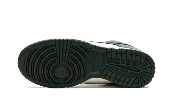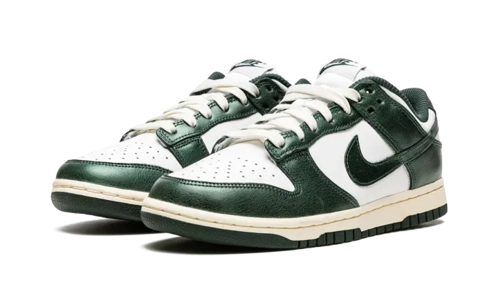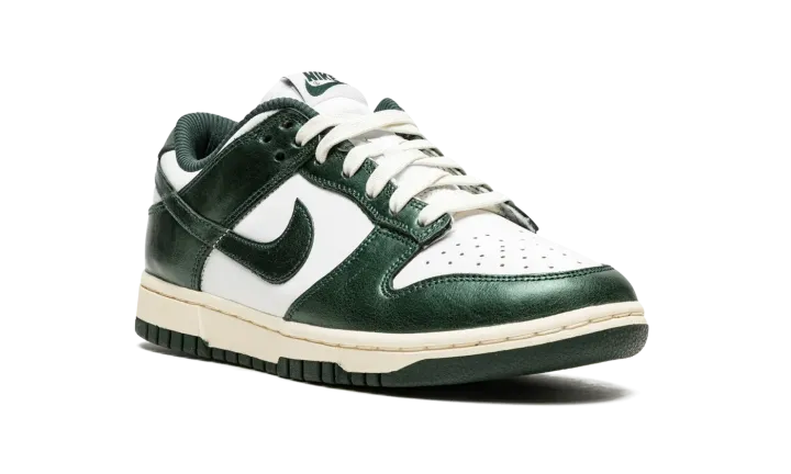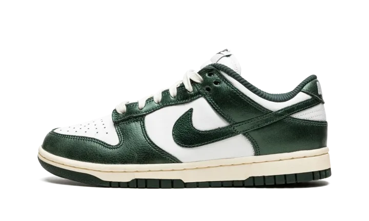 The Women's Nike Dunk Low "Vintage Green" is a women's-exclusive colorway of the classic sneaker with a collegiate flair. While not officially associated with the school, the "Vintage Green" is reminiscent of the Michigan State Spartans college basketball team, as it features the same green and white colors on its design as the Spartans' team uniforms. Moreover, the "Vintage Green" honors the Dunk's storied history as a mid-1980s college basketball team shoe with its aged, vintage look. The cream rubber midsole mimics the oxidation process rubber undergoes after years of use. Up top, the shoe features a white leather base. The Vintage Green leather overlays and Swoosh branding have a slight sheen and textured finish that mimics the look and feel of vintage leather. Cream white laces complete the throwback-inspired look.