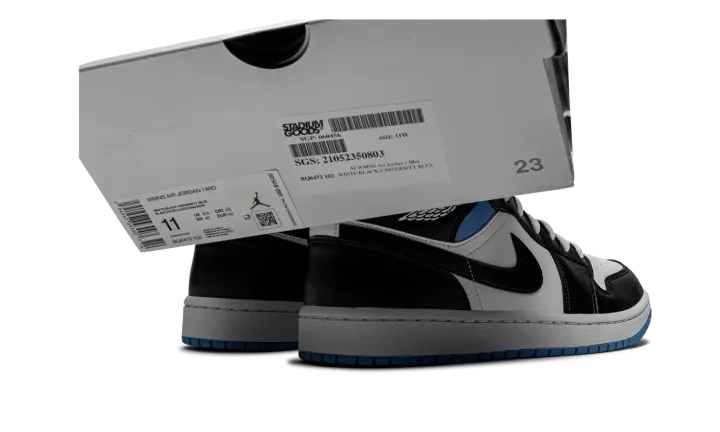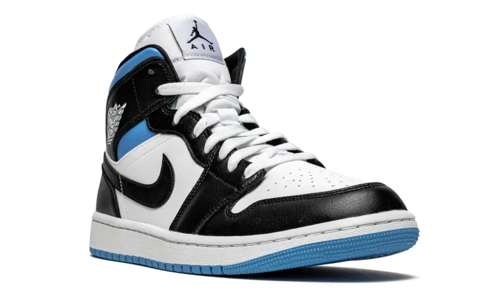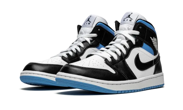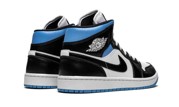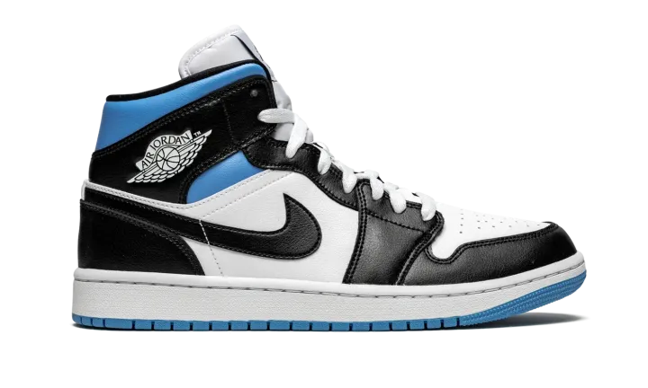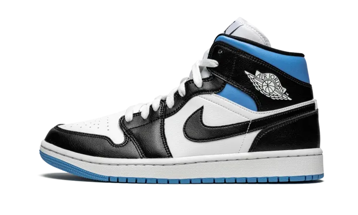 The Women's Air Jordan 1 Mid "Black/White/University Blue" is a women's exclusive version of Michael Jordan's first signature shoe in a versatile colorway. In mid-top form, the "Black/White/University Blue" features white leather on the perforated toe and mid-panel. The forefoot, eyelets, collar, heel, and Swoosh are dressed in black leather. A white "Wings" graphic appears on the black leather overlay above the University Blue collar and a black Jumpman and "Air" logo can be found on the white nylon tongue tag. Underfoot, a white rubber midsole and contrasting University Blue outsole complete the look.