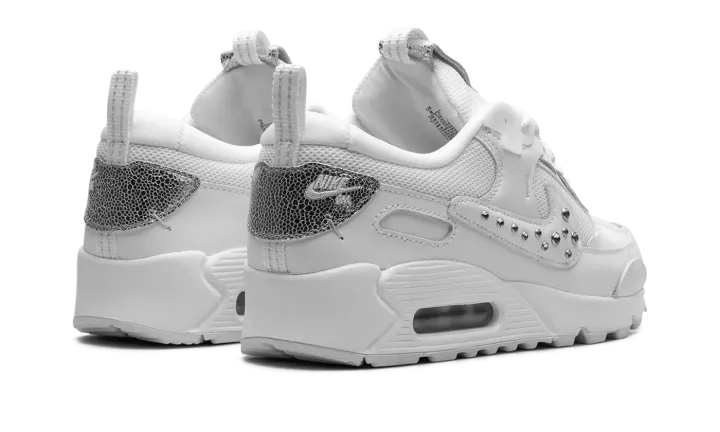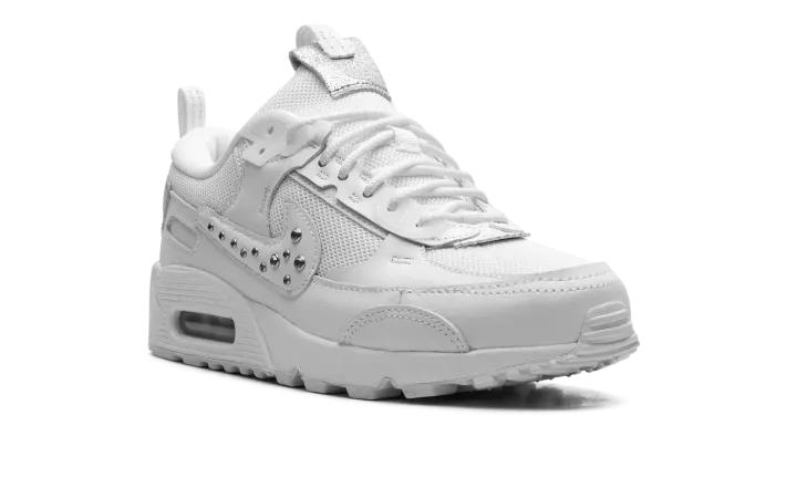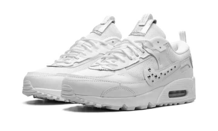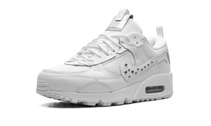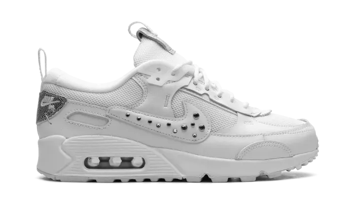 The Women's Nike Air Max 90 Futura "Studded Swoosh" is a women's-exclusive colorway of the modern version of the retro running shoe. The Air Max 90 Futura updates the iconic sneaker with a contemporary design edge that includes a new construction of overlays, a modified Swoosh, and more updated detailing. Here, the "Studded Swoosh" features a white mesh base with tonal leather overlays. Metallic Silver studs appear on the Swoosh. A modified tongue overlay features classic "Nike" branding, as does the corner heel tab. The shoe retains the Air Max 90's original midsole design.