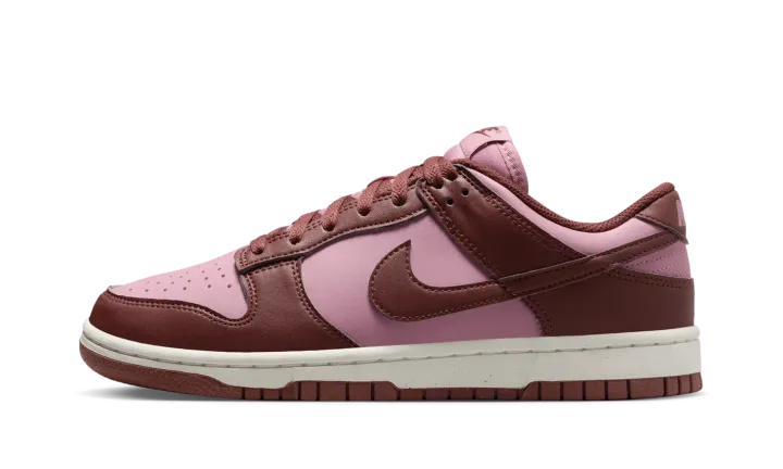 The Nike Women's Dunk Low Next Nature 'Dark Pony Elemental Pink' features a vibrant pink base with reddish-brown overlays and a color-matched Swoosh.
