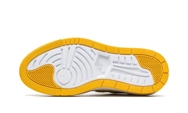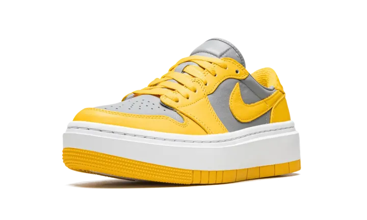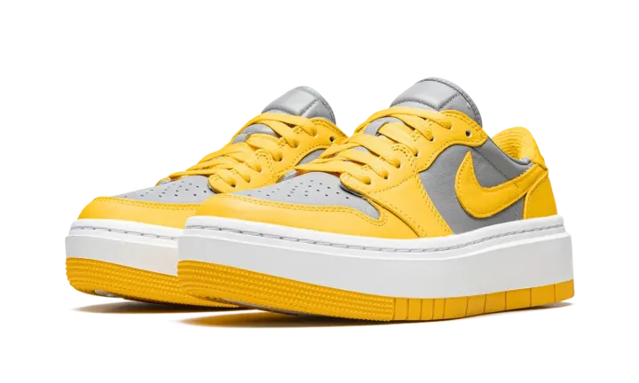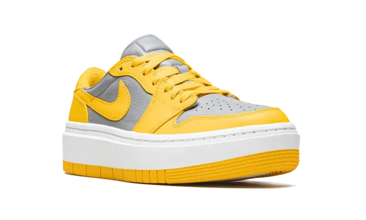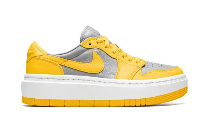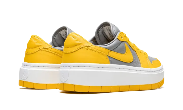 The Women's Air Jordan 1 Low Elevate "Varsity Maize" is a women's-exclusive colorway of the casual shoe with a platform-style sole. The Jordan 1 Low Elevate is equipped with an oversized white rubber sole that adds significant height to the wearer, and is yet another example of Jordan Brand progressing the Jordan 1's design into the future. Cement Grey-colored leather is found on the perforated toe and mid-panel. Varsity Maize leather overlays and Swoosh branding contrast the neutral-colored base. A bubble-style "Wings" logo appears on the heel.