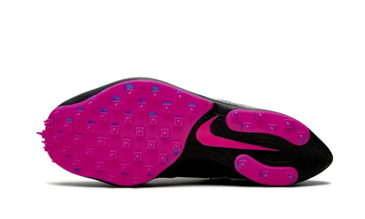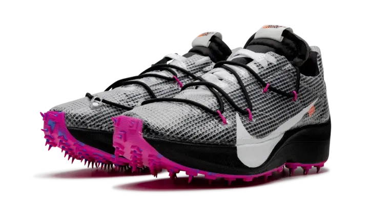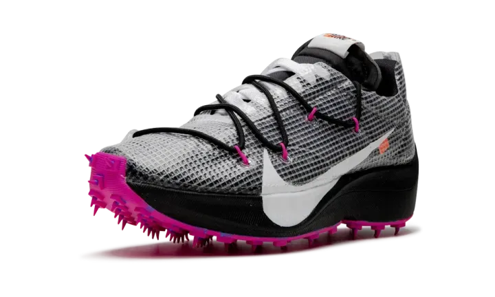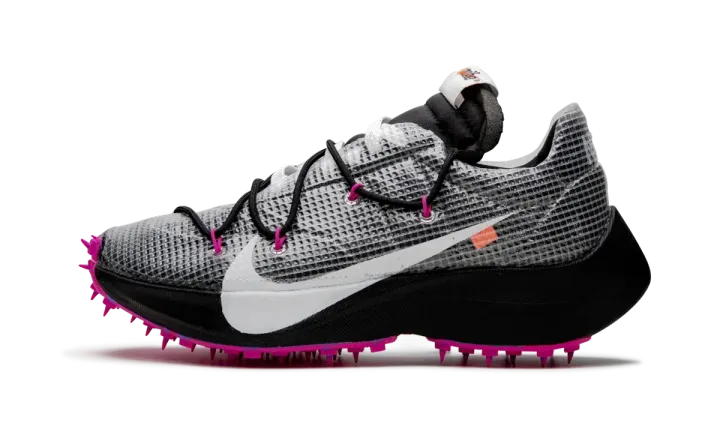 The Off-White x Nike Zoom Vapor Street "Black/Laser Fuchsia" bakes components of the Nike VaporFly and Zoom Fly into its DNA for a futuristic silhouette concocted by Virgil Abloh. A trademark of Abloh's design process has included merging the past with the present, and even future, to create innovative ideas. True to form, elements of the Vapor Street include a synthetic semi-translucent material covering the entire upper. An offset lacing system with black laces and an oversized white Swoosh that starts on the mid-panel and lowers onto the midsole adds unique flavoring to the design. Hits of bright pink contrast the predominantly black upper. The pink and blue marbled outsole is outfitted with rubber spikes in a large cluster at the forefoot and more sporadically at the heel. Release date: October 3rd, 2019.