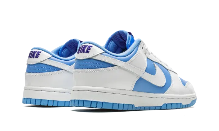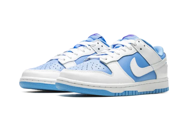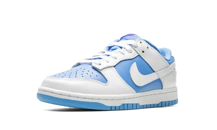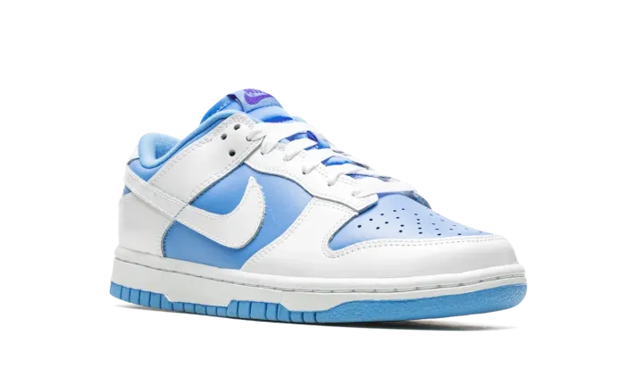 The Women's Nike Dunk Low "Reverse UNC" is a women's-exclusive colorway that flips the color block of the original "UNC" Dunk from 2021. As its name implies, the "Reverse UNC" inverts the "UNC's" white and blue color block. The perforated toe, mid-panel, collar, and heel are designed in University Blue leather. Contrasting white leather appears on the overlays and Swoosh branding. A Concord-colored "Nike" logo is embroidered on the heel. Additional Concord accenting can be found on the "Nike" and Swoosh logos on the white nylon tongue tag. A white midsole and University Blue-colored rubber outsole finish off the shoe's collegiate-inspired look. Release date: August 2, 2022