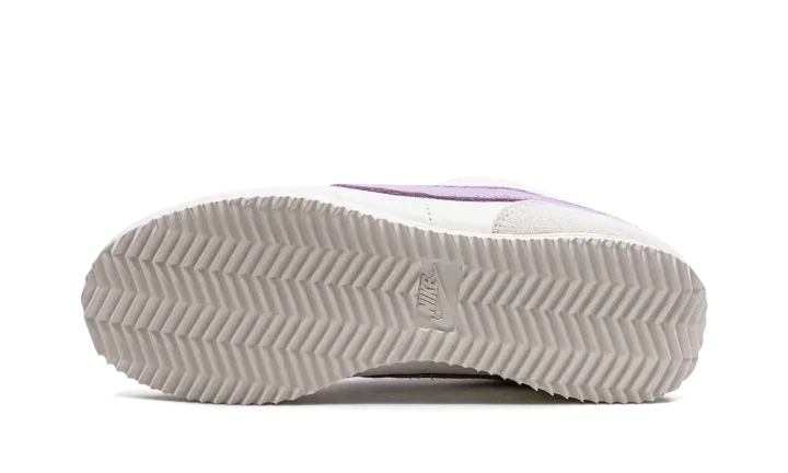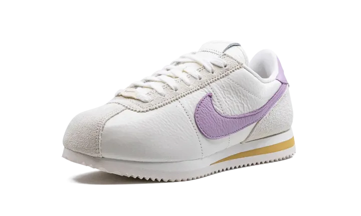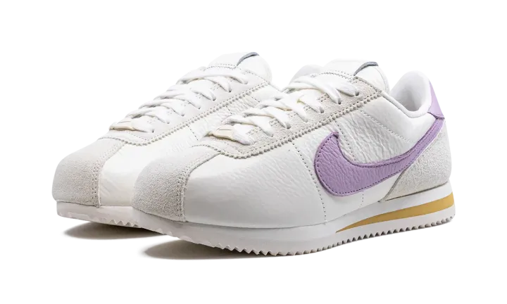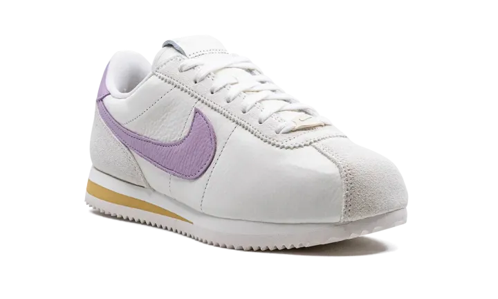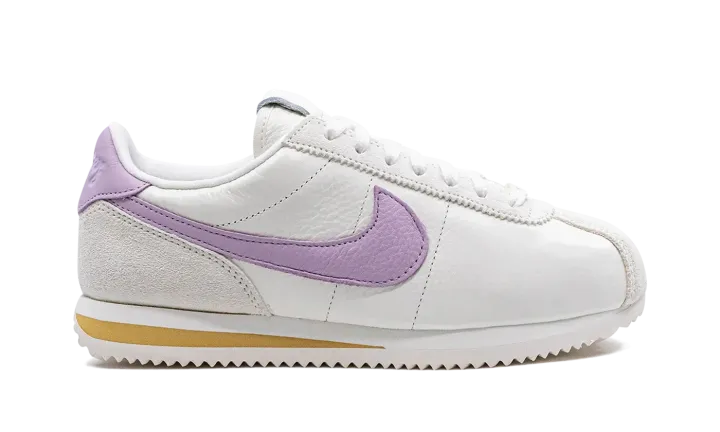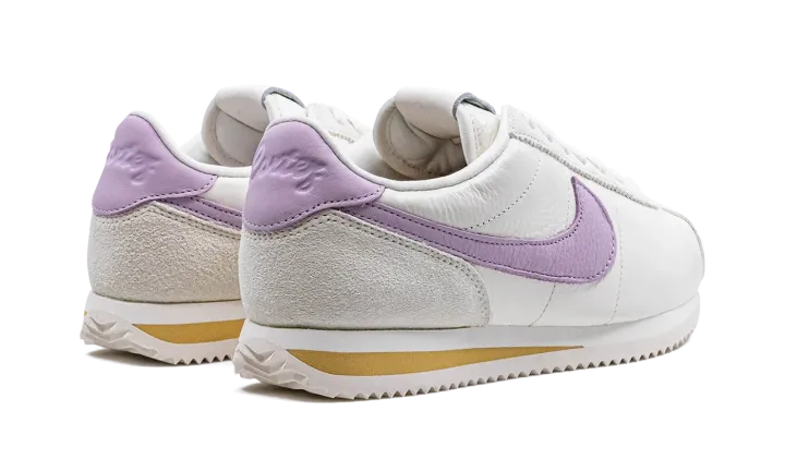 The Women's Nike Cortez SE "Sail/Iced Lilac" is a women's-exclusive colorway of the retro running shoe with a premium yet casual look. The sneaker features a white tumbled leather construction with a light grey suede overlay on the toe and an Iced Lilac leather Swoosh and heel tab. Debossed "Cortez" branding appears on the back of the shoe while "Nike" detailing is located on the tongue tag. The shoe rides on a white midsole accented with gold trim.