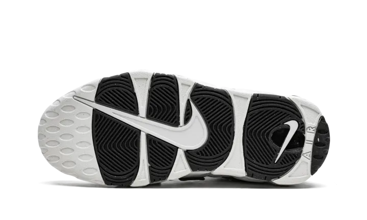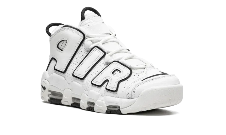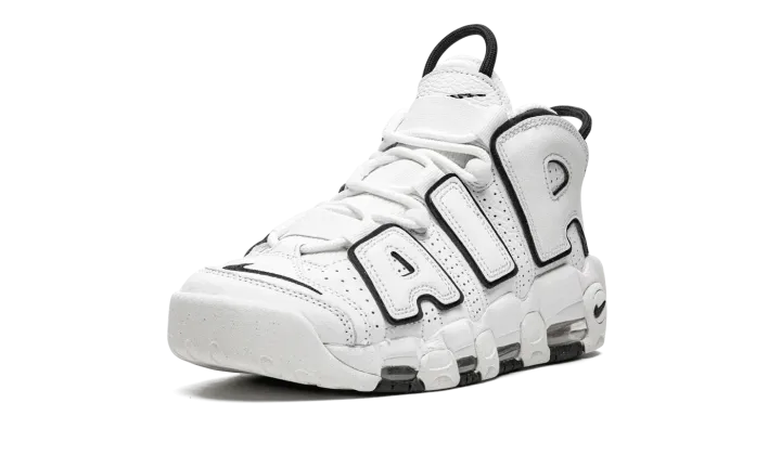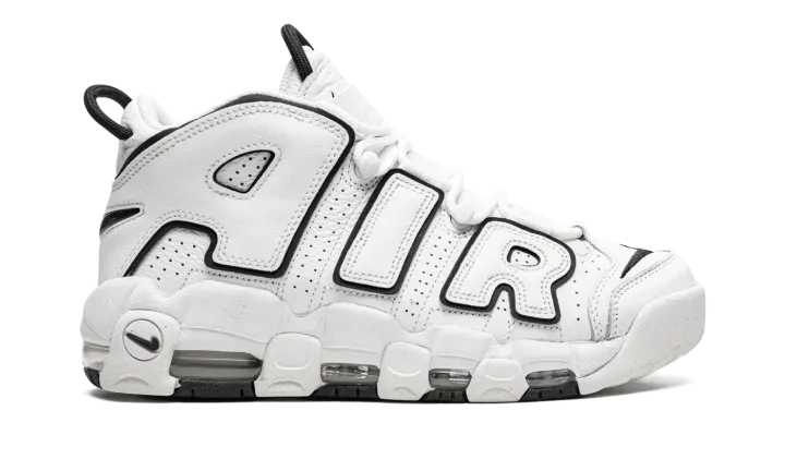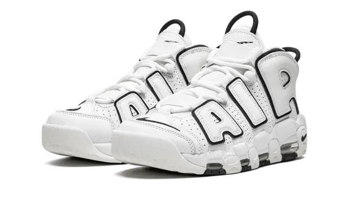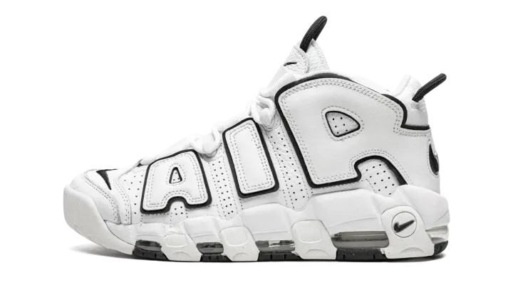The Women's Nike Air More Uptempo "White/Black" is a women's-exclusive version of the '90s basketball shoe in a versatile white and black colorway. The upper features large "AIR" branding outlined in black that brings a '90s-style, graffiti-inspired look to the table. A black jeweled Swoosh is found on the heel and a black Swoosh is embroidered on the toe. A black Swoosh appears on the tongue. The shoe's upper is constructed in perforated white leather. Two pull tabs on the tongue and heel provides easy on/off wearability. Underfoot, visible Air bubbles in the midsole finish off the look. Release date: March 1, 2022