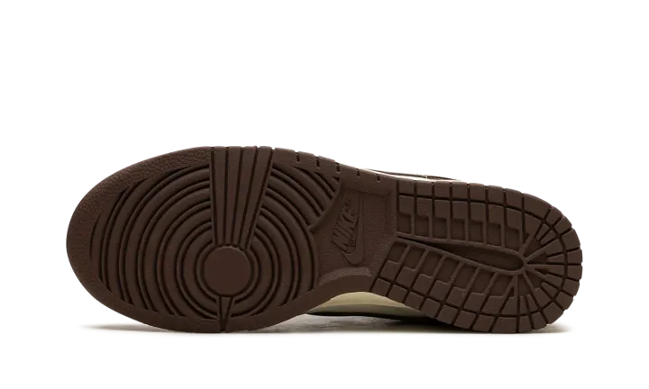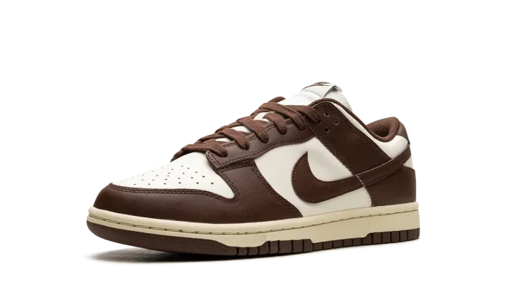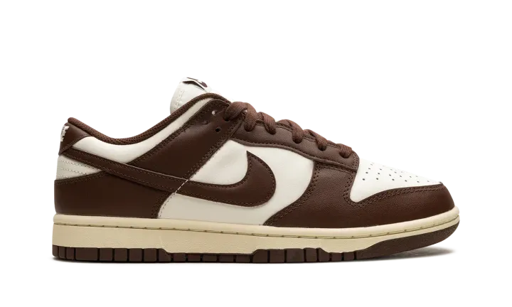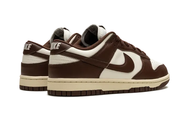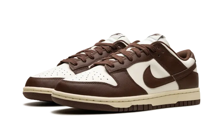The Women's Nike Dunk Low "Cacao Wow" is a women's-exclusive colorway of the retro basketball shoe with an old school look. Called the "Cacao Wow" colorway by Nike, this Dunk Low features an off-white white upper with Cacao Wow, or brown, leather overlays and Swoosh branding. Classic "Nike" branding is embroidered on the back of the collar and "Nike" and Swoosh branding are found on the tongue tag. Underfoot, the shoe's aged-looking midsole gives the silhouette a classic, vintage look.