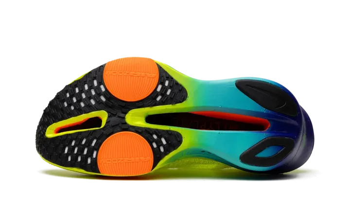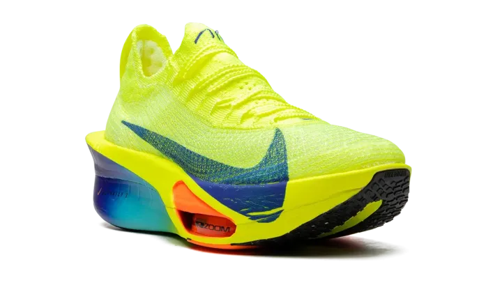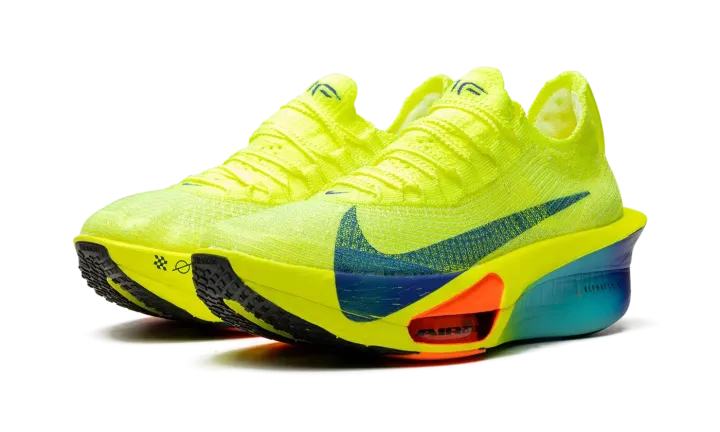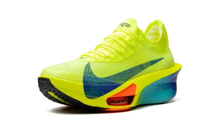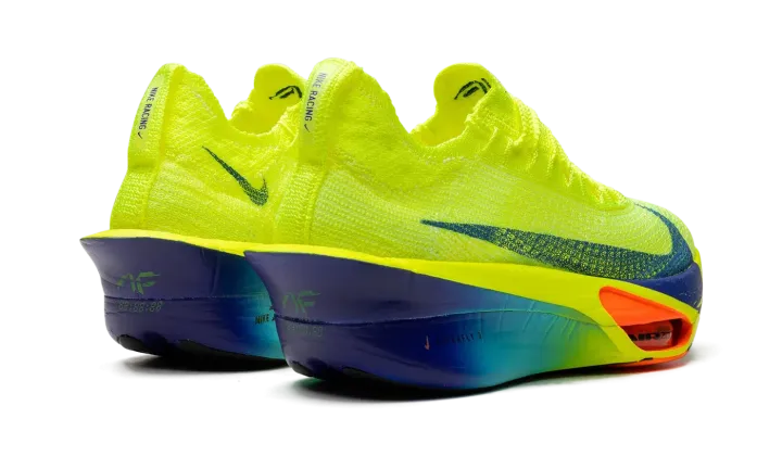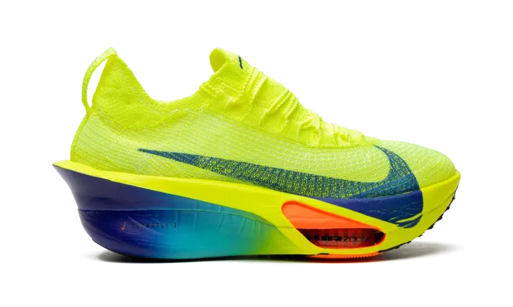 The Women's Nike ZoomX AlphaFly 3 "Volt" is the women's sizing of the neon green colorway of the performance running shoe. The Nike ZoomX AlphaFly 3 was worn by long-distance runner Kelvin Kiptum during his record-setting performance in the 2023 Chicago Marathon. The AlphaFly 3 features design elements from its predecessors, the AlphaFly 1 and 2. On this colorway, the upper has an ultra lightweight Atomknit construction in an eye-catching Volt hue that is matched with Zoom Air pods in the forefoot for optimal performance and energy return. An oversized Concord-colored Swoosh appears on the lateral side of the profile, completing the look.