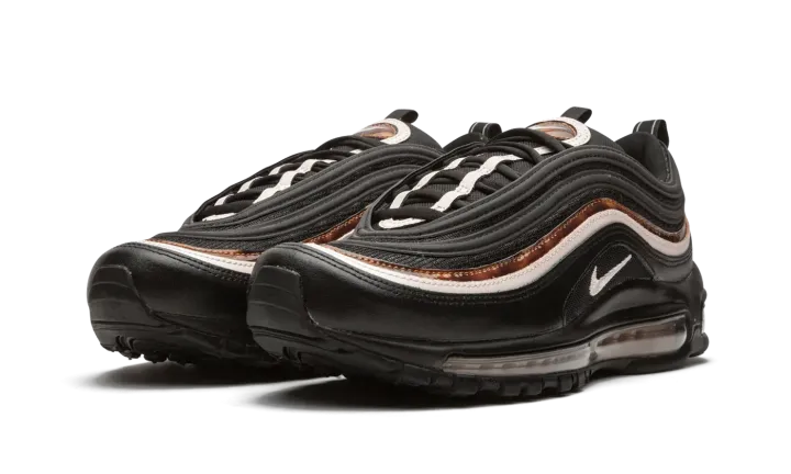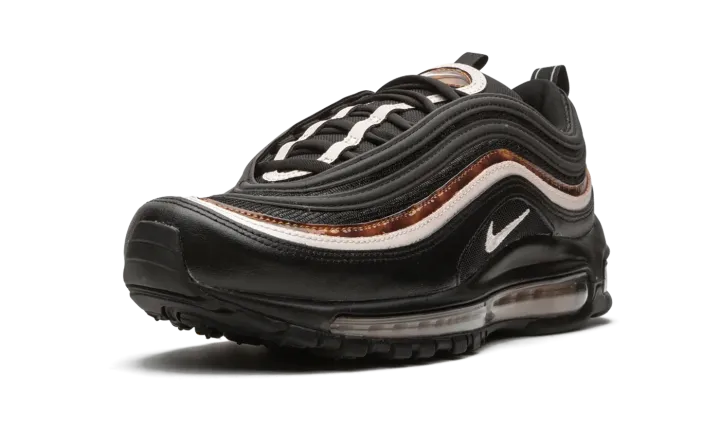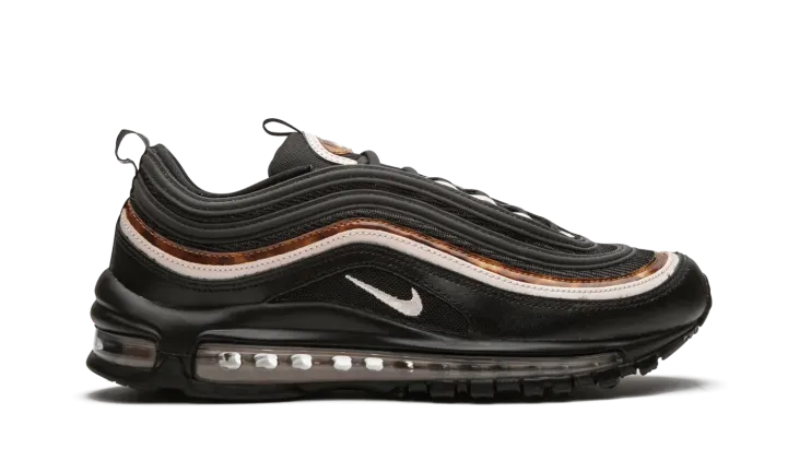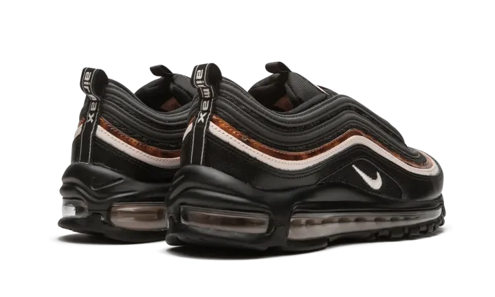 The Nike Air Max 97 "Woodgrain'' brings premium details and refined textures into the design of the classic running silhouette. The mostly black upper is elevated with subtle accents of soft pink and marbled woodgrain along the mid-foot panels. The woodgrain pattern, mostly known as a feature in luxury cars, is also added to the tongue logo and on the insole. The Nike Air Max 97 "Woodgrain" colorway is finished with a clear Air sole unit and black outsole.