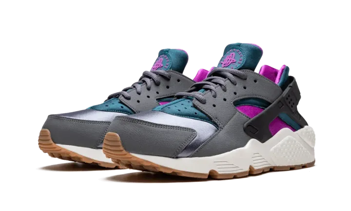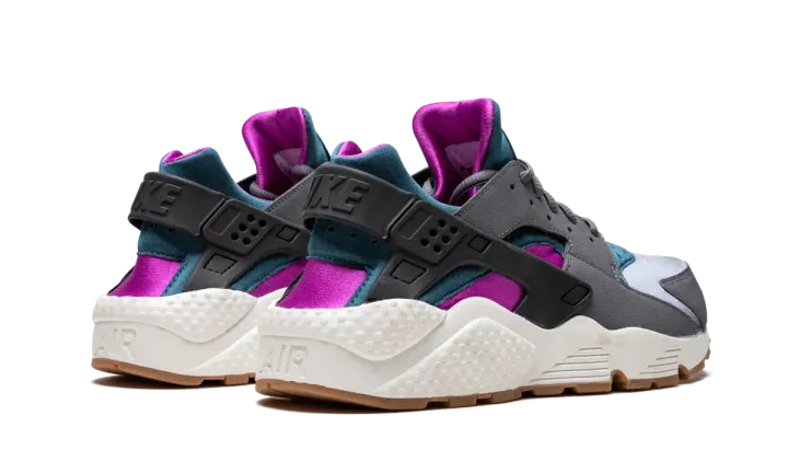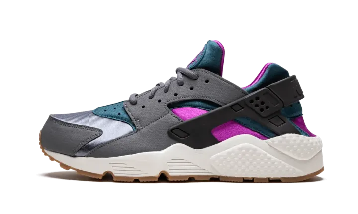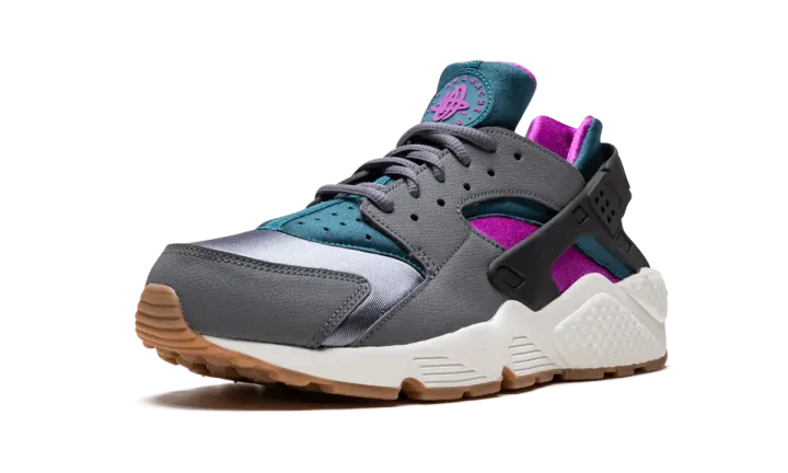 Another stylish option of the Nike Air Huarache just for the ladies, this version features a dark grey upper with teal and purple accents completed with a gum rubber outsole.