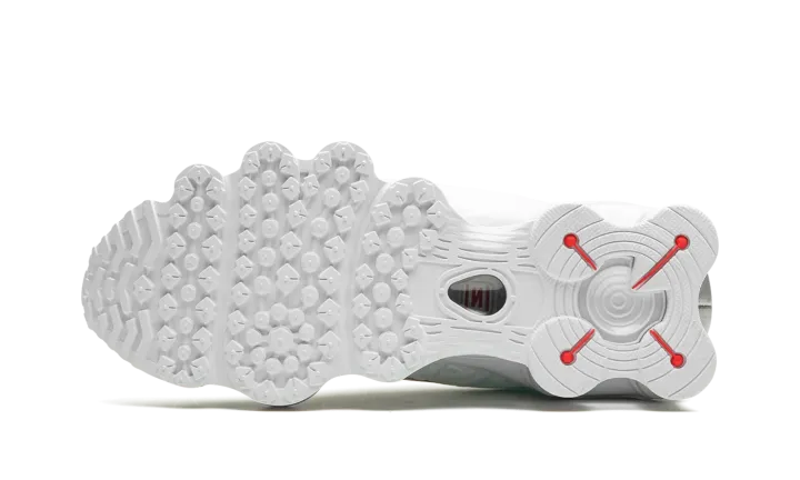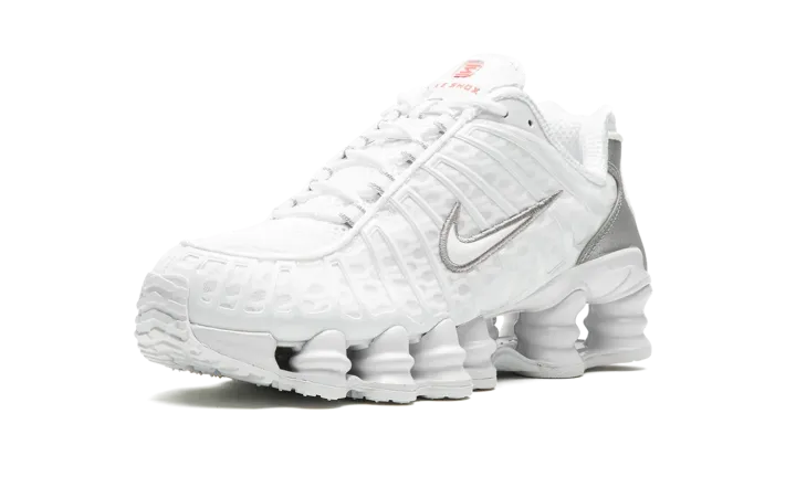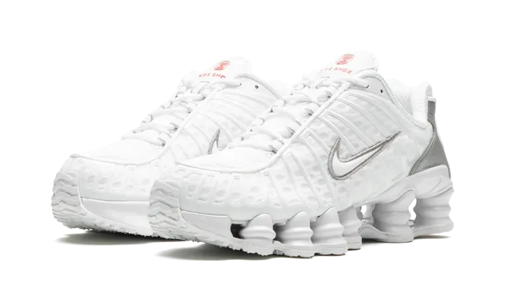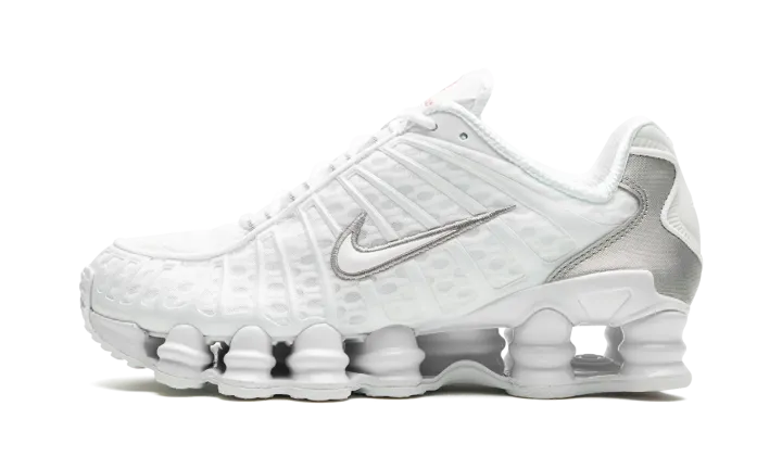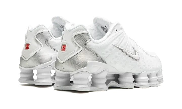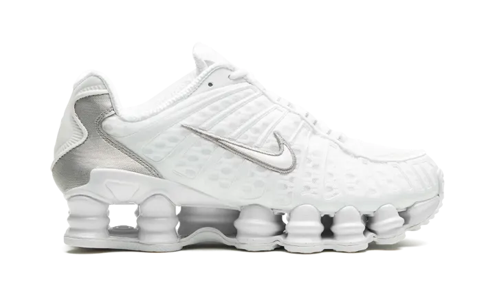 The Women's Nike Shox TL "White" is the women's sizing of the retro sneaker in a monochromatic white colorway. The shoe features a white fabric construction with tonal TPU overlays. A white patent leather Swoosh logo appears on either side of the shoe. "Nike Shox" branding is seen on the tongue. Underfoot, the Shox TL's signature piston-shaped columns underfoot provide both a comfortable and responsive ride, as well as vintage, Y2K-era flair.
