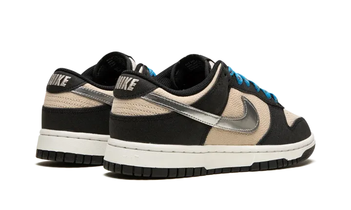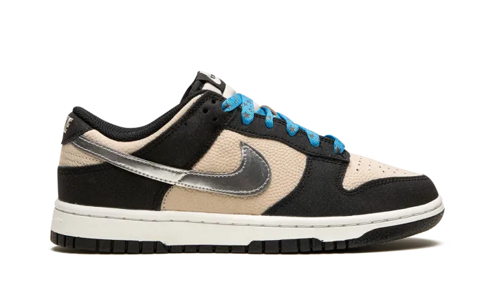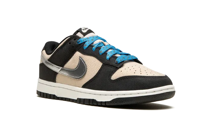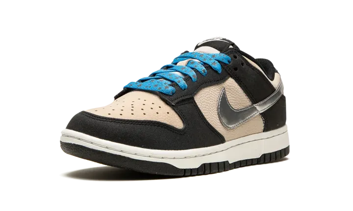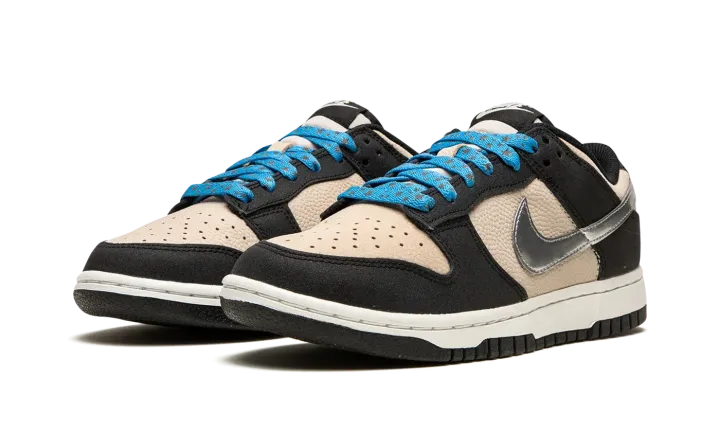 The Women's Nike Dunk Low "Starry Laces" is a women's-exclusive colorway of the vintage basketball shoe with a decidedly premium-looking design. As its name suggests, the "Starry Laces" version of the Dunk Low features laces with an added star motif that implies a casual vibe. As for the rest of the shoe, the base is designed in Light Bone leather while the overlays are rendered in a black synthetic leather. A Metallic Silver Swoosh appears on the mid-panel. "Nike" branding is embroidered in gold lettering on the heel.