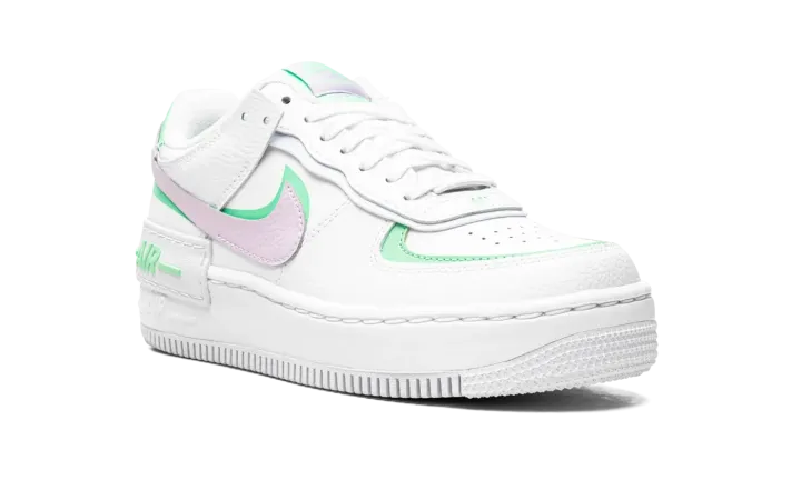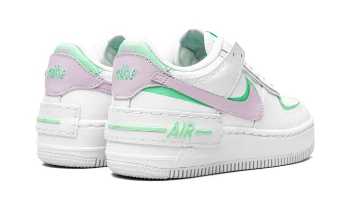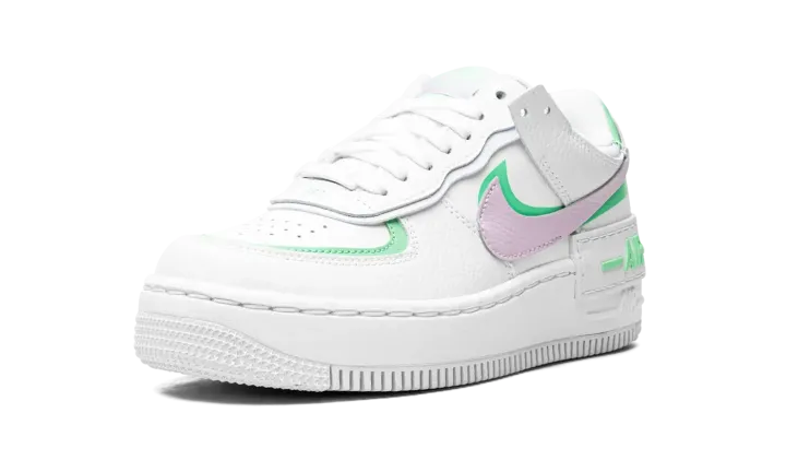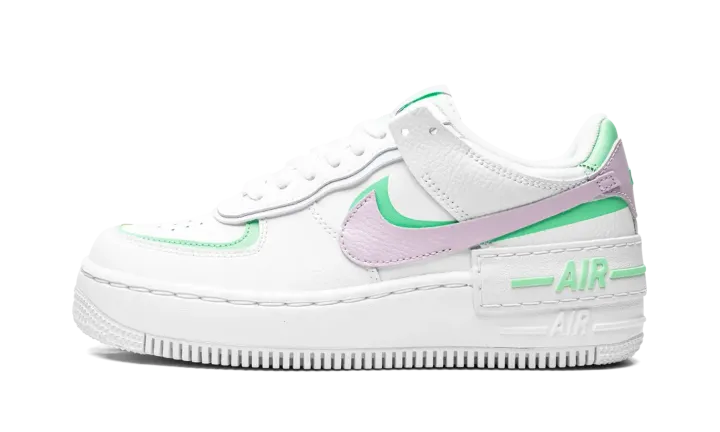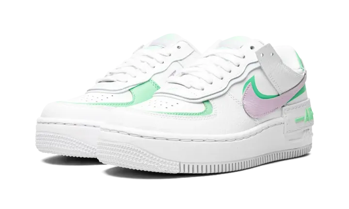 The Women's Nike Air Force 1 Low Shadow "Infinite Lilac" is a vibrant colorway of the classic sneaker with a contemporary re-design. Looking to the beloved retro basketball shoe for inspiration, the Air Force 1 Low Shadow is a fun interpretation that displays a layered or "double" theme reminiscent of the style popularized by Nike collaborators such as Off-White and sacai. The upper features a white tumbled leather construction with overlapping panels. A Infinite Lilac tumbled leather Swoosh is placed over a green Swoosh on both sides. Additional green accenting borders the perforated toe and appears on the heel tab beneath the lilac leather panel with "Nike" branding. A doubled layered tongue and eyelet panels present a modern, cutting edge look that calls to mind the design of sacai's numerous Nike collaborations. A white leather overlay with green "Air" detailing is situated above the Air Force 1's original "Air" detailing on the white rubber midsole.