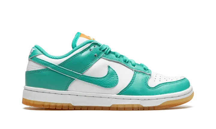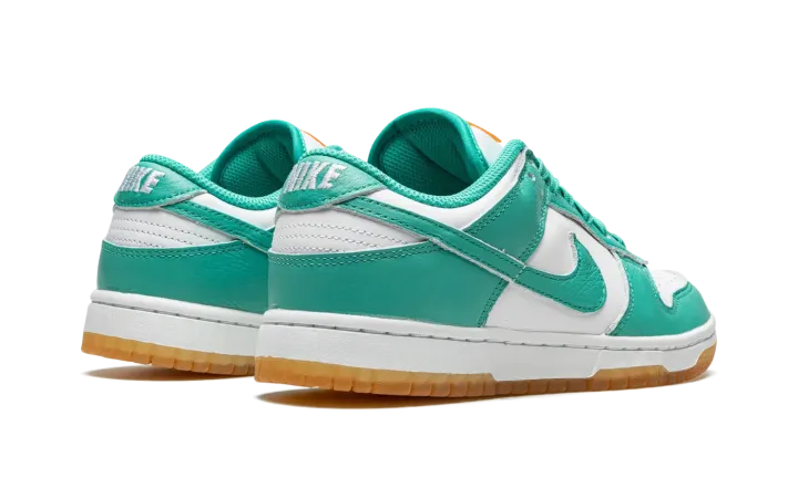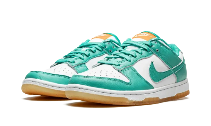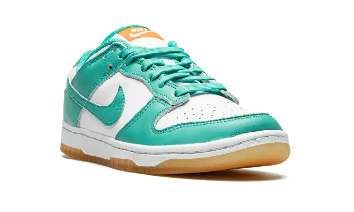 The Women's Nike Dunk Low "Teal Zeal" is a women's-exclusive colorway of the vintage basketball and lifestyle shoe that was released in July 2022. A summer-ready colorway, the "Teal Zeal" features an appealing combination of white leather on its base, and Teal Zeal-colored leather on its overlays and Swoosh branding. A white "Nike" logo is embroidered on the heel. An orange tongue tag with "Nike Dunk" branding contrasts the look of the white tongue. Teal Zeal laces continue the shoe's bold style. Underfoot, a white rubber midsole and gum outsole complete the design. Release date: July 13, 2022