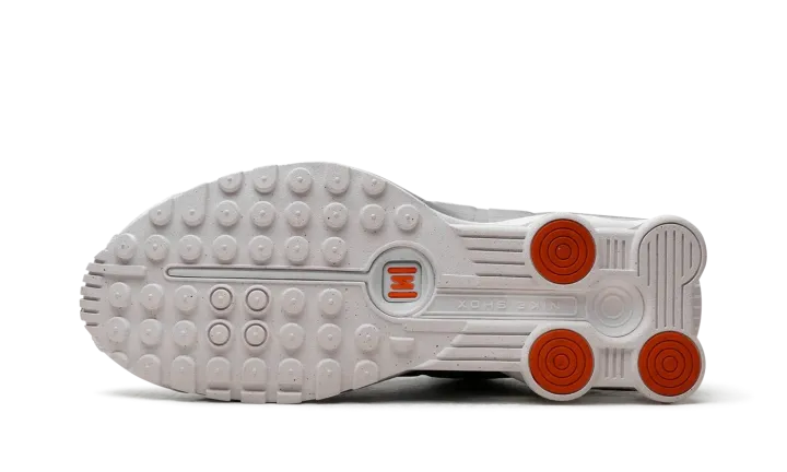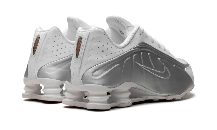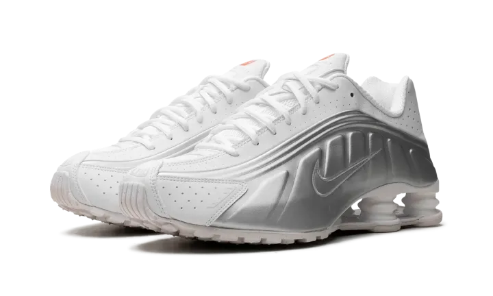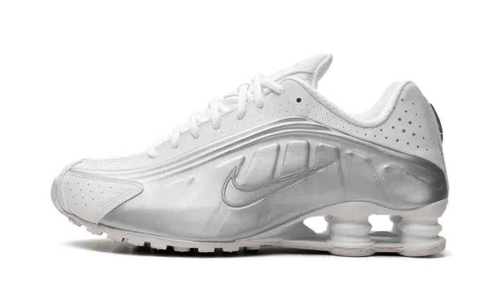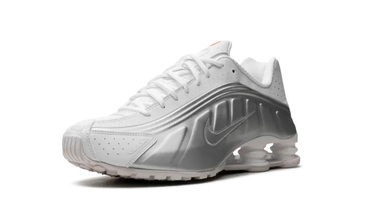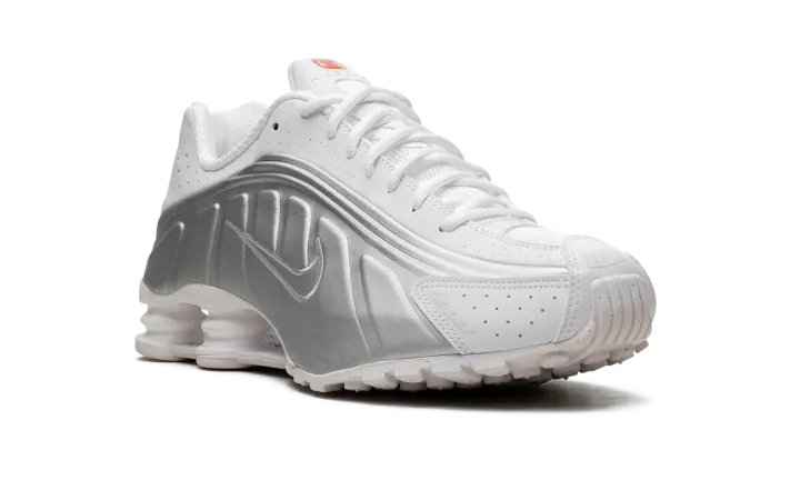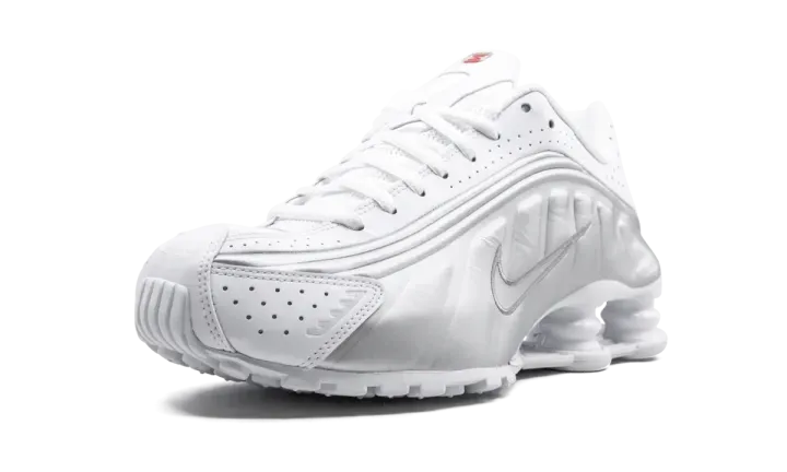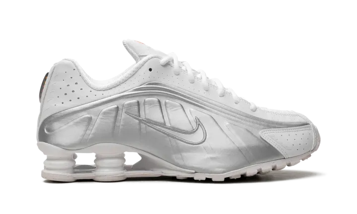 The Nike Shox R4 women's shoe is built with soft and durable synthetic and textile materials that bring forth a disruptive retro aesthetic, in a good way. The majority of the upper takes on a pristine combination of metallic silver and bright white. Perforations near the toe and around the ankle enhance breathability, and the four-pronged foam cushioning system and Pebax stability plate provide exceptional cushioning and unparalleled shock absorption. Finally, red accents the tongue, footbed, heel, and the bottom of the sole.