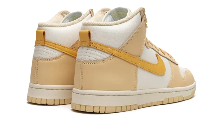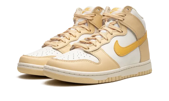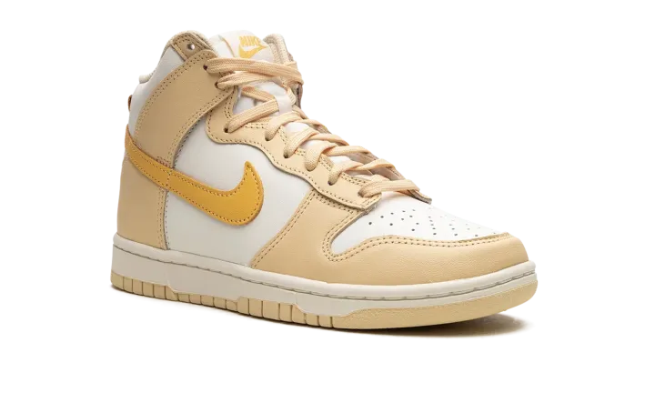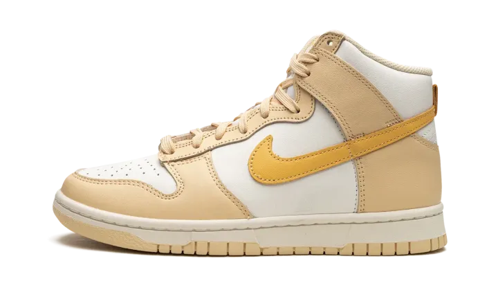 The Women's Nike Dunk High "Pale Vanilla" is a women's-exclusive colorway of the popular retro basketball and lifestyle shoe with a spring and summer vibe. The "Pale Vanilla" features a white leather base with Pale Vanilla leather overlay panels. A Topaz Gold leather Swoosh can be found on both sides of the shoe. The orange-gold hue also appears on the "Nike" and Swoosh branding on the tongue tag. Underfoot, a white midsole and Pale Vanilla rubber outsole put the finishing touches on this Dunk High in women's sizing. Release date: March 14, 2023