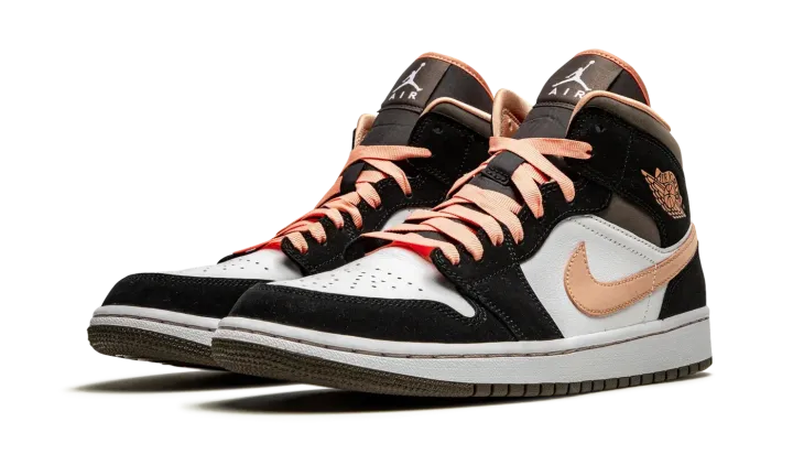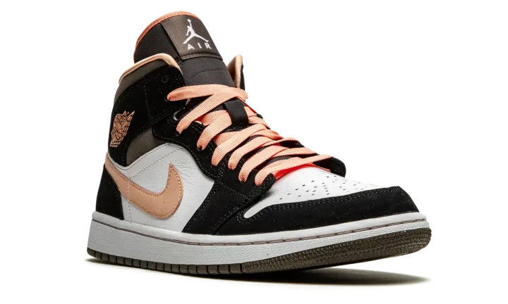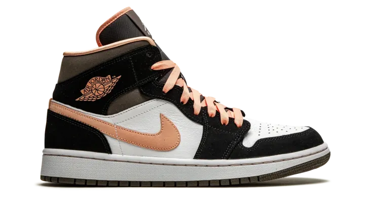 The Women's Air Jordan 1 Mid "Peach Mocha" is a women's edition of Michael Jordan's first signature shoe in a spring and summer-ready colorway. The alternate Jordan 1 Mid debuted in 2007 as part of the "New/Old Love" pack that paid homage to Michael's love of basketball and his newfound appreciation for competitive motorsports. In the years since, the Jordan 1 Mid has become one of the most popular and creative canvases for Jordan Brand, which is exemplified by this "Peach Mocha" design. Black synthetic nubuck overlays on the forefoot, eyestay, collar, and heel contrast the upper's white leather base while a Peach leather Swoosh can be found on either side of the shoe. The same pinkish hue appears on the "Wings" branding on the collar and on the laces on top of the black nylon tongue. A white Jumpman logo graces the branding tag stitched onto the tongue to finish off the look.