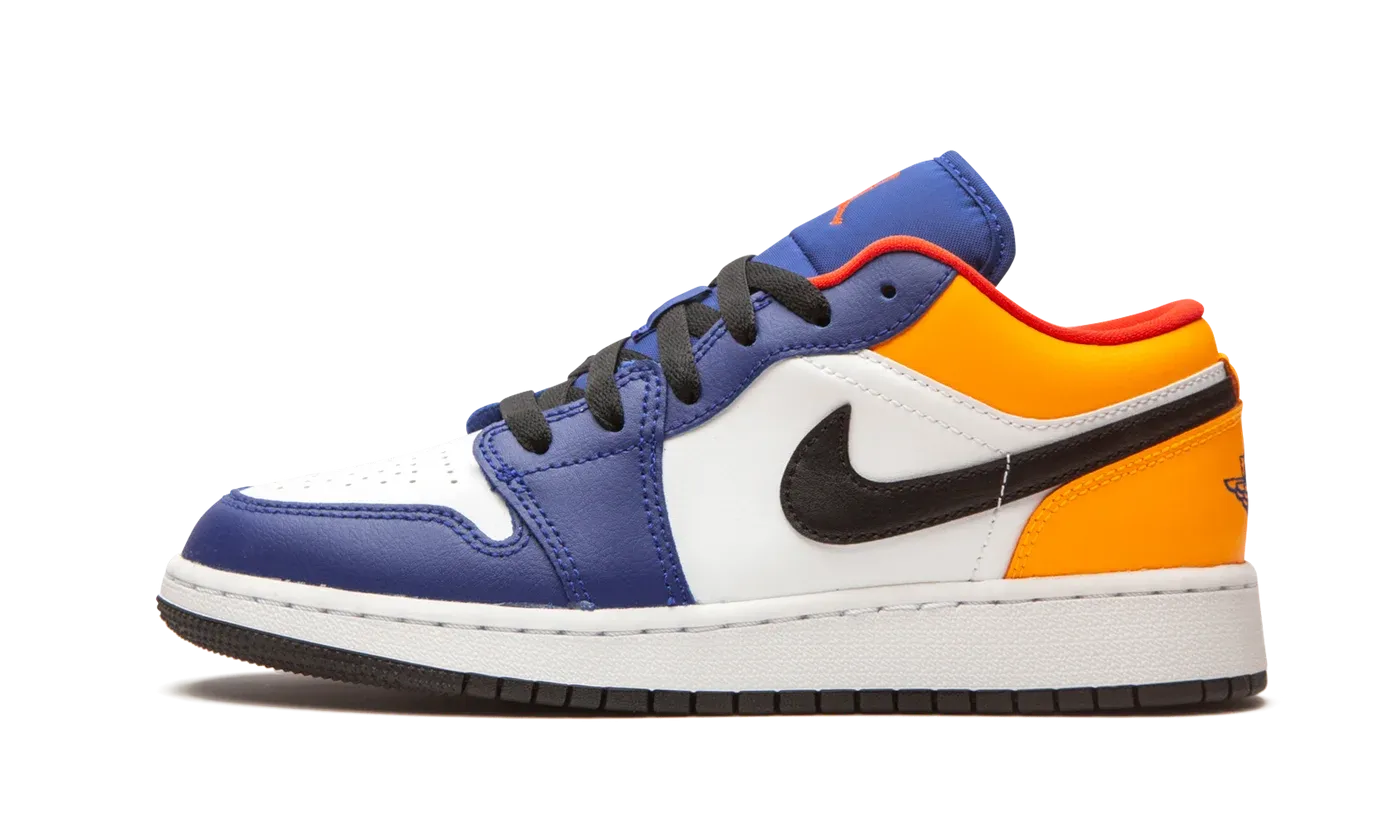 The Air Jordan 1 Low GS "Royal/Yellow" is a multicolor take on Michael Jordan's first signature shoe fitted in youth sizing. Appearing on the alternate low-top Jordan 1, the "Royal/Yellow" design is the kind of bold shoe that kids enjoy wearing. The upper features white leather on the perforated toe and mid-panel. Royal leather overlays on the forefoot and eyelets break up the neutral appearance. Jordan Brand opts for yellow leather around the collar and heel. A black leather Swoosh dots the mid-panel, and blue "Wings" embroidery is sewn onto the heel. Red Jumpman insignia is located on the blue nylon tongue. Black shoelaces, a red liner, and white midsole finish off the look of this Air Jordan 1 Low in youth sizing.