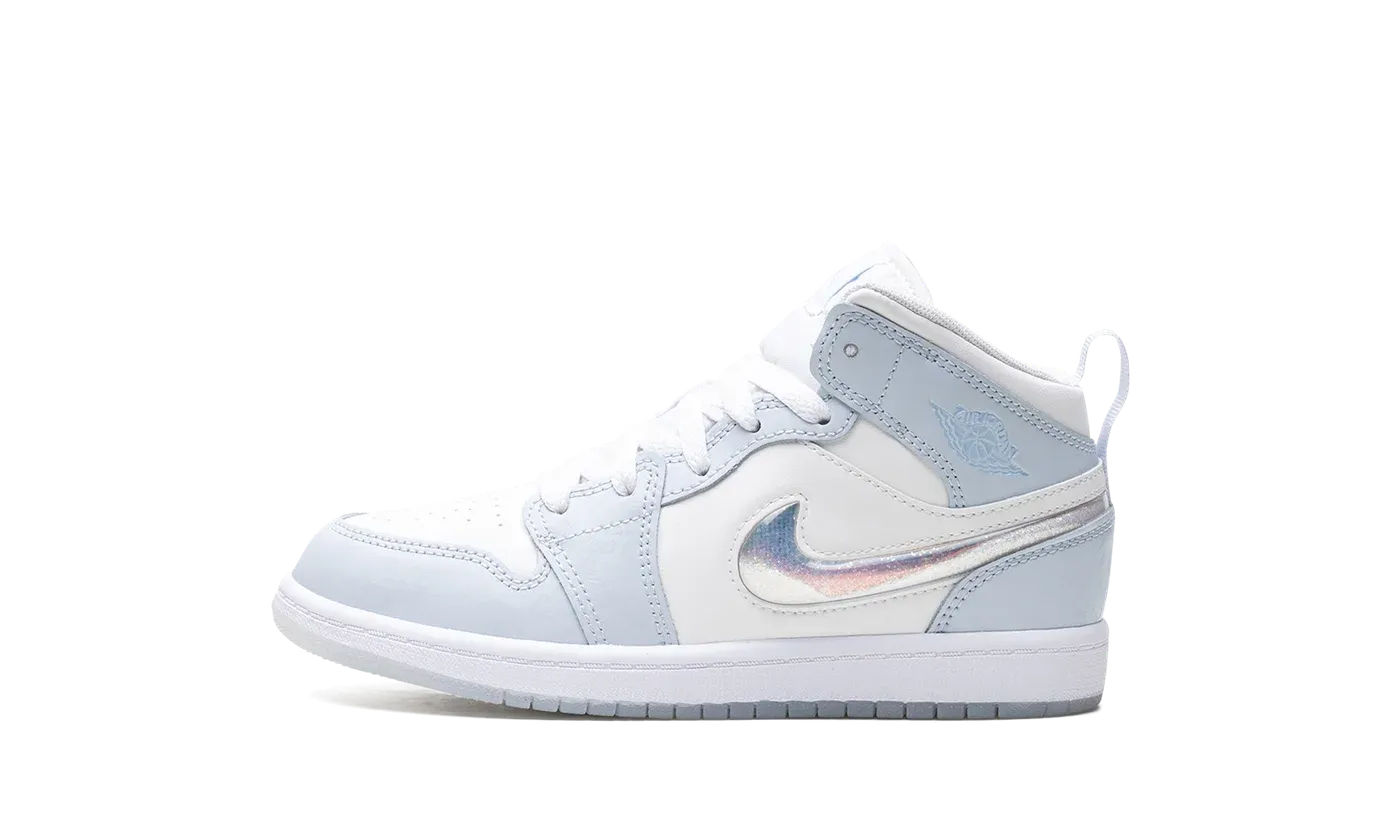 The Air Jordan 1 Mid PS "Glitter Swoosh" is the preschool sizing of the shoe with a winter-inspired design. The upper is complete with a Summit White leather construction with Blue Tint leather overlays. The Swoosh on the lateral side is constructed in clear plastic with glitter that can move around inside it for a unique and fun look inspired by snow globes. A light blue "Wings" logo can be found on the collar, while a Jumpman appears on the tongue tag. Underfoot, a white midsole and icy blue translucent outsole complete the winter theme. Release date: November 27, 2023