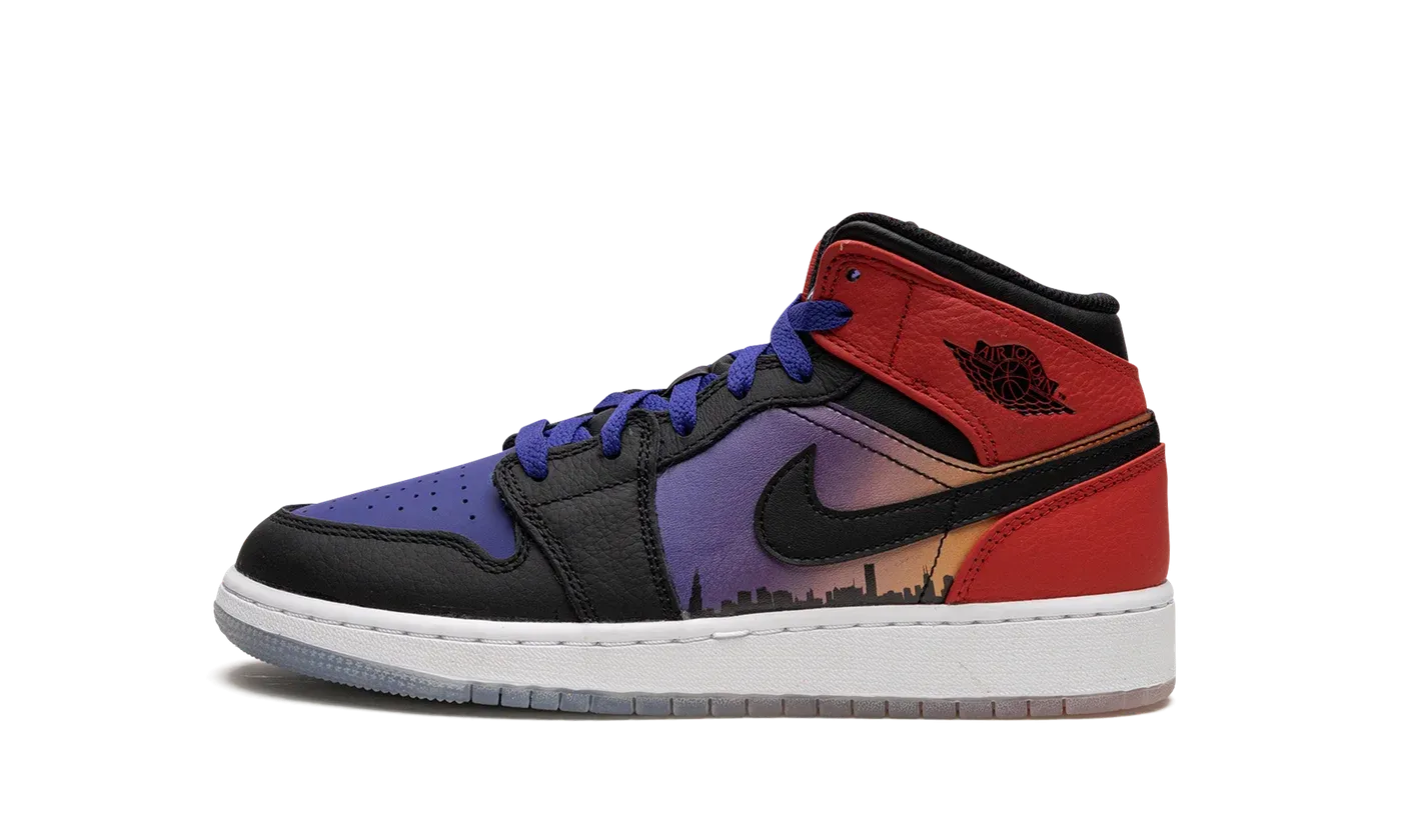 The Air Jordan 1 Mid GS "Skyline" is the youth sizing of the popular lifestyle shoe in a colorway that pays tribute to Chicago's skyline. The "Skyline" Jordan 1 Mid is inspired by Chicago's skyline, which served as the backdrop in the iconic photo of Michael Jordan dunking a basketball while doing the famous Jumpman pose. Psychic Purple leather appears on the shoe's perforated toe while contrasting black leather is found on the overlays on the toe cap, forefoot, and eyelets. Fiery University Red leather lands on the collar and heel. The highlights of the shoe are the graphic of Chicago's skyline on the mid-panel and the photo of Jordan doing the Jumpman pose on the tongue tag. A gradient purple-to-orange-to-red design is found beneath the clear rubber outsole. Release date: March 29, 2023