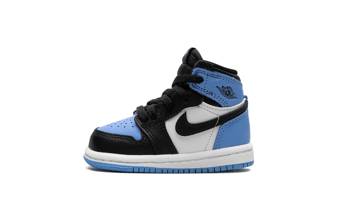 The Air Jordan 1 Retro High OG TD "UNC Toe" is the toddler sizing of the first Air Jordan shoe in a colorway inspired by the model's original "UNC" and "Black Toe" styles. On the "UNC Toe," the Jordan 1 features a University Blue leather perforated toe that's contrasted with black leather overlays on the toe cap, forefoot, and eyelets. The "UNC Toe" also includes white leather on the mid-panel and University Blue leather on the collar and heel. A black leather Swoosh and black "Wings" logo can be found on the mid-panel and collar, respectively. The University Blue accenting is a nod to Michael Jordan's alma mater, the University of North Carolina, as well as the Jordan 1's original "UNC" colorway. Release date: July 22, 2023