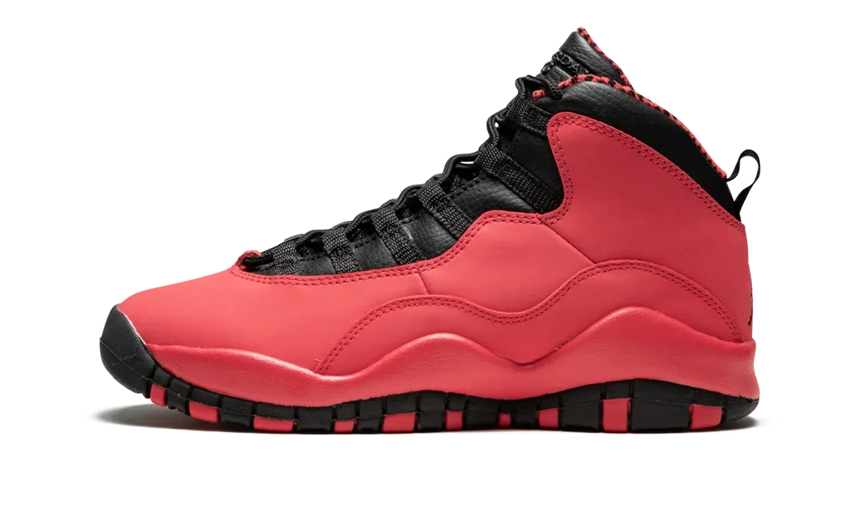 Red and black leather Air Jordan 10 Retro sneakers from jordan featuring a round toe, a lace-up front fastening, an ankle length, branded heel counter, a pull tab at the rear and a rubber sole. These styles are supplied by a premium sneaker and street wear marketplace. Stocking only the most sought-after footwear and clothing, they source and curate some of the most hard-to-find items from around the world.