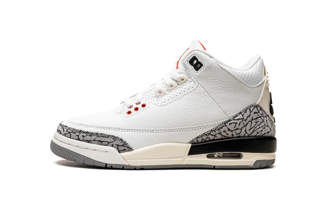 The Air Jordan 3 GS "White Cement Reimagined" is the youth sizing of the special version of the vintage basketball sneaker that replicates its original design. Released in 2023 to celebrate the iconic Jordan 3's 35th anniversary, the "White Cement Reimagined" retains the look of the model's "White Cement" colorway with accurate-to-original panels, colors, and overall shape. Faithful to the 1988 version of the Jordan 3 "White Cement," the "Reimagined" features a higher-cut ankle collar inspired by the OG Jordan 3's design. It also is equipped with a white leather upper with contrasting grey elephant print on the toe and heel, which has also been modified to look like the detailing on the original Jordan 3. The "Nike Air" branded heel counter has an aged, vintage look, as does the midsole. Release date: March 11, 2023