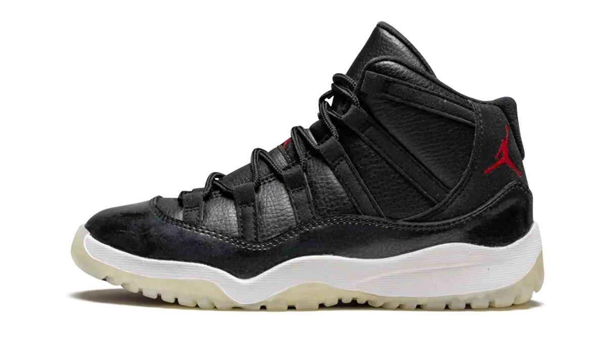 An all-new colorway of the Air Jordan 11 for 2015, the "72-10" edition pays tribute to Michael Jordan's historic 72-win season with the Chicago Bulls in 1995-96. The new take on a Bulls color scheme for the iconic silhouette features a luxurious black leather upper with with an icy outsole and metallic red accents. No Air Jordan 11 collection is complete without a pair. This listing is for Pre-School sizing only.