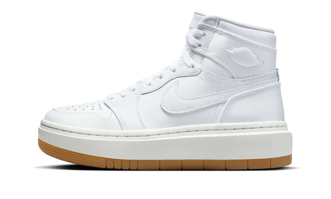 The Women's Air Jordan 1 Elevate High "White/Gum" is a women's-exclusive colorway of the lifestyle sneaker with a platform-style sole. The Jordan 1 Elevate High modifies the Jordan 1 High with a contemporary twThe rest of the shoe still remains somewhat consistent with the Jordan 1 High OG model. The upper features a monochromatic white leather appearance with a bubble-style "Wings" logo on the heel.