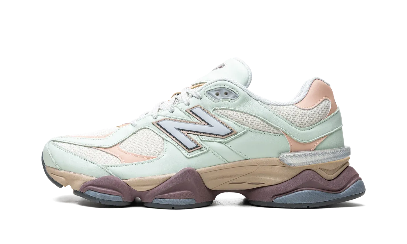 Discover the unique New Balance 9060 "Clay Ash." Released in Spring 2024, this lifestyle shoe features a cream mesh upper accented with soft mint and pink overlays. An oversized silver "N" with burgundy trim adds a stylish touch, while "NB 9060" detailing appears on the tongue. The chunky midsole, with EVA and ABZORB cushioning, showcases a burgundy hue and aged finish.