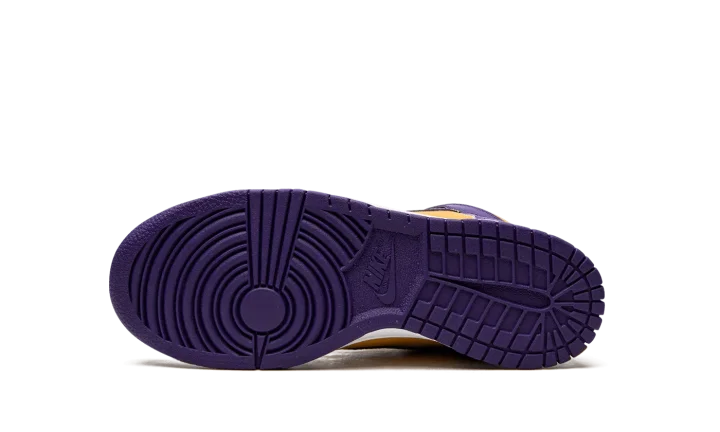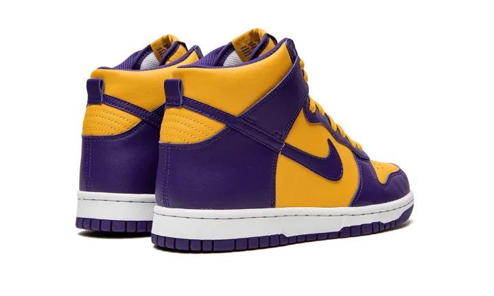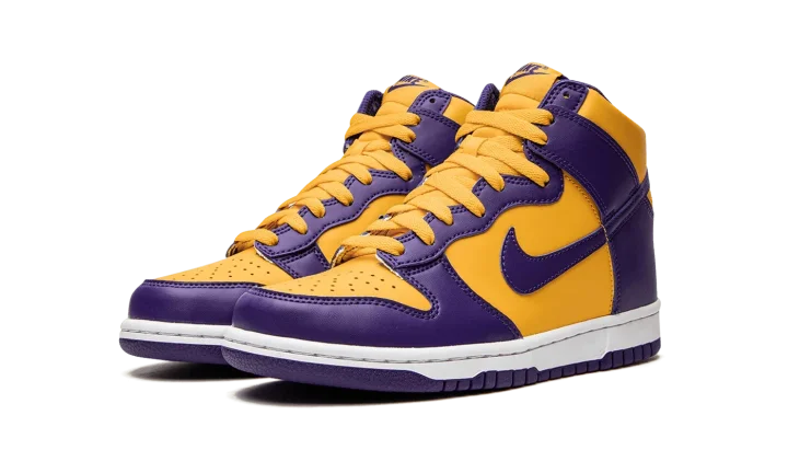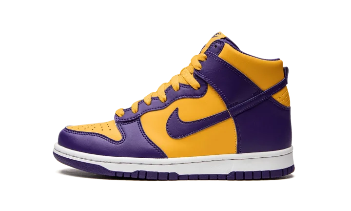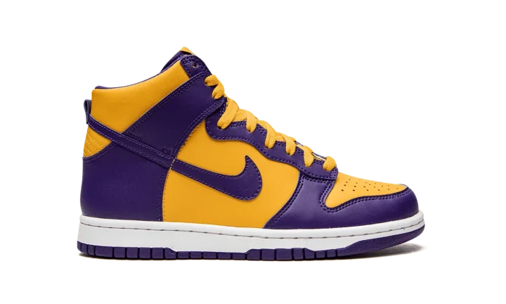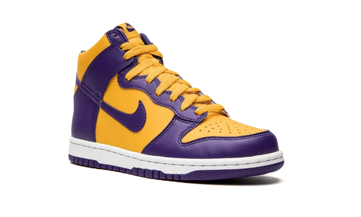 The Nike Dunk High GS "Lakers" is the youth sizing of the colorway of the classic shoe that features the team uniform colors of the Los Angeles Lakers. Sans official Lakers branding, the design nonetheless salutes the storied basketball team with its University Gold leather base and contrasting Court Purple leather overlays and Swoosh branding. The "Nike" and Swoosh logos on the yellow nylon tongue are also designed in purple. Yellow laces, a white midsole, and purple rubber outsole complete the look. Release date: September 22, 2022