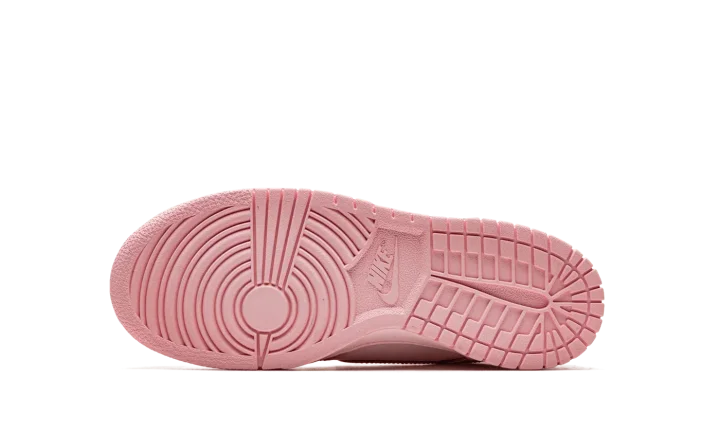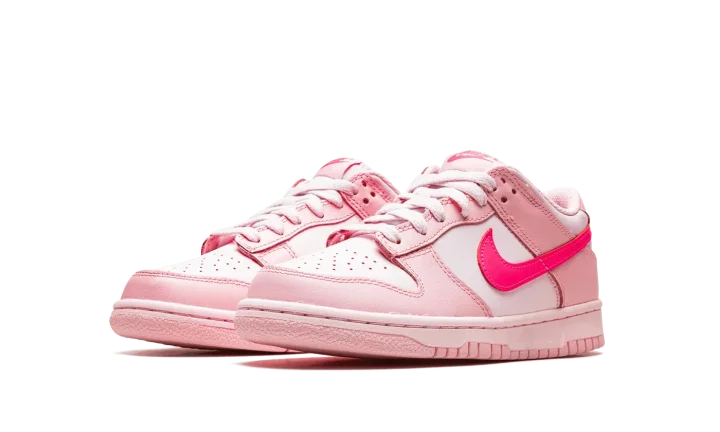 The Nike Dunk Low GS "Triple Pink" is the youth sizing of the vintage basketball shoe in a colorway featuring various shades of pink. The "Triple Pink" features light pink leather on the perforated toe, mid-panel, collar, and heel. The overlays are designed in a medium shade of pink leather. A neon pink leather Swoosh is found on both sides of the shoe. The same shade of pink appears on the "Nike" branding embroidered on the heel and the "Nike" and Swoosh detailing on the tongue tag. The shoe's all-pink appearance is continued on the midsole and outsole.