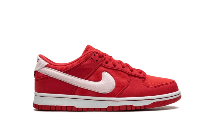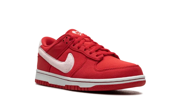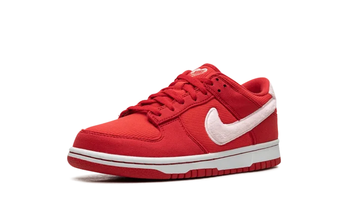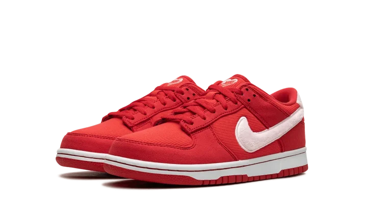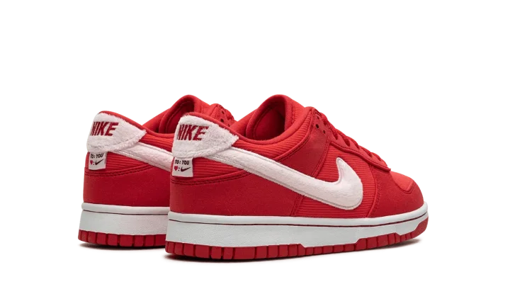 The Nike Dunk Low GS "Valentine's Day Solemates" is a youth version of the retro basketball shoe inspired by the popular February holiday. Featured in colors associated with Valentine's Day, the "Valentine's Day Solemates" colorway features a red corduroy-like base and tonal textile overlays. A fuzzy white Swoosh inspired by the material commonly found on stuffed animals appears on the sides, while red "Nike" branding is embroidered on thefuzzy heel tab. A special tag reading "To: You, ♥: ✔" can be seen on the heel. Unique heart emblems are found on the tongue. Release date: February 2024