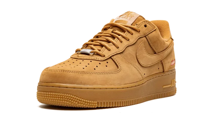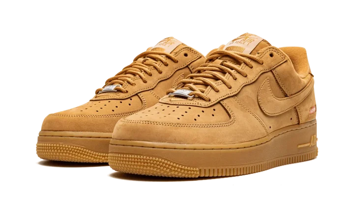 The Supreme x Nike Air Force 1 Low "Wheat" is a Fall/Winter 2021 collaboration between the "World Famous" streetwear brand and Nike on a classic, fall and winter colorway of the retro basketball shoe. The "Wheat" Air Force 1 is designed and inspired by iconic cold weather footwear staples in New York City, particularly construction boots. Supreme's version of the colorway stays true to the original "Wheat" style, save for the added small red Box Logo on the heel. The entire upper, including the perforated toe, mid-panel, and Swoosh, are designed in Flax nubuck. The rope laces and nylon tongue also appear in Flax, as well. The monochromatic look is finished off with a wheat-colored rubber sole with "Air" branding on the heel. Release date: November 5, 2021