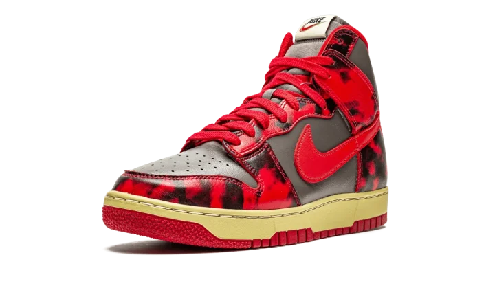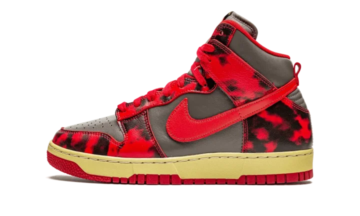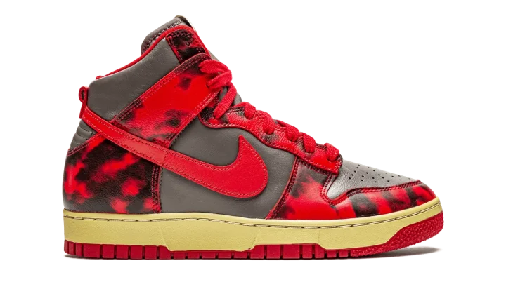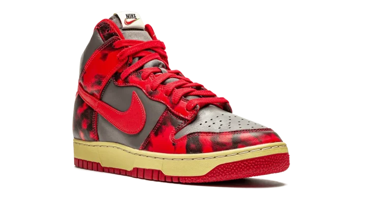 Dunk High 1985 SP "Chile Red" sneakers from NIKE featuring red, grey, signature Swoosh logo detail, round toe, perforated detailing, front lace-up fastening, logo patch at the tongue, ankle-length, branded insole and rubber sole. These styles are supplied by a premium sneaker marketplace. Stocking only the most sought-after footwear, they source and curate some of the most hard to find sneakers from around the world..