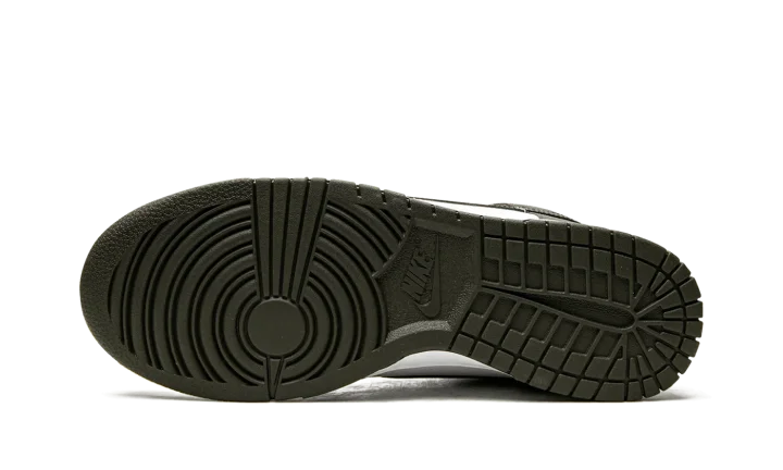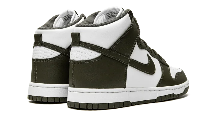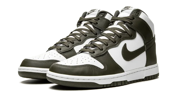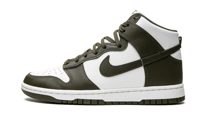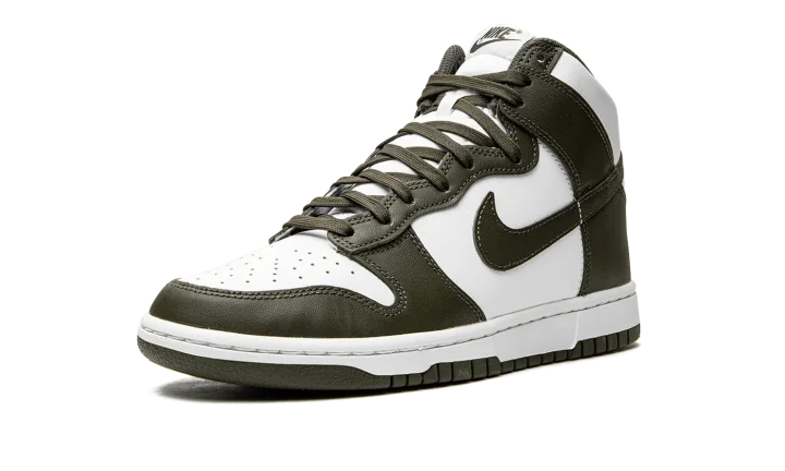 Originally released in 2017, the Nike Dunk High "Cargo Khaki" made a comeback during the Summer 2022 season. Arriving in two-tone White and Cargo Khaki color, this Nike Dunk High comes constructed in a full leather build featuring a white leather base with Cargo Khaki, or dark green, overlays. The green hue continues on the laces, tongue label, Swoosh, liner and rubber outsole.