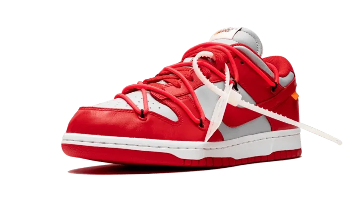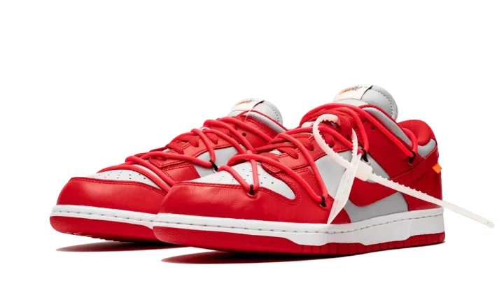 The Off-White x Nike Dunk Low "University Red" is Virgil Abloh's rendition of the early-aughts classic Dunk design. The highly anticipated collaboration between Off-White and Nike on the Dunk comes on the heels of a string of high-profile releases between the two brands. The upper features a light grey leather base on the mid-panel, toe, and ankle collar. Contrasting University Red leather overlays appear on the forefoot, toe, lateral panel, ankle collar, and heel. Standard-issue red laces are present, and then Abloh adds his own lacing system as staggered bold orange laces cover parts of the entire upper. Putting the finishing touches on the design is a white rubber sole with a red outsole.