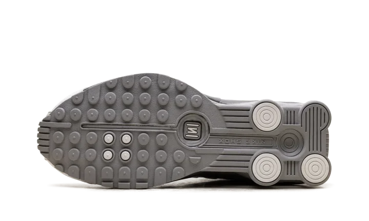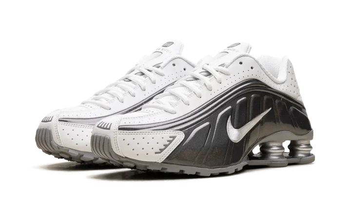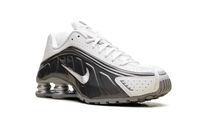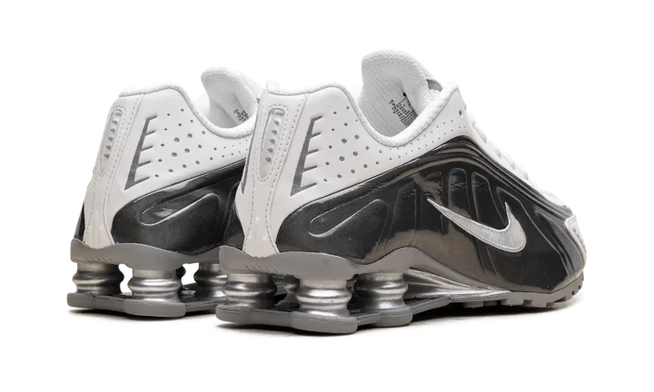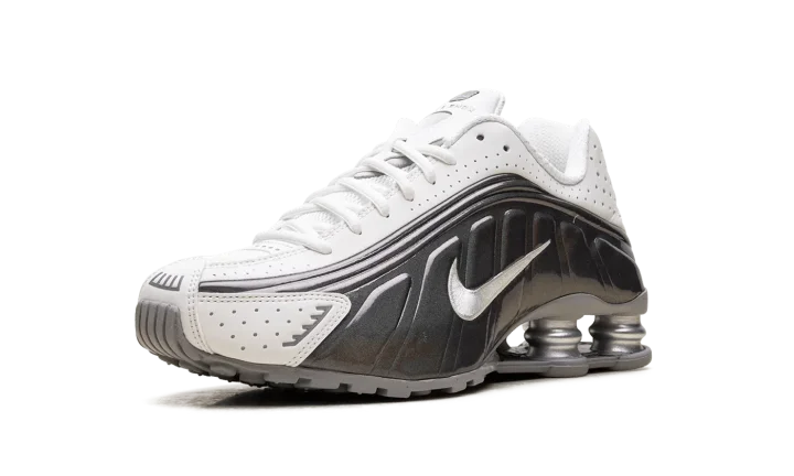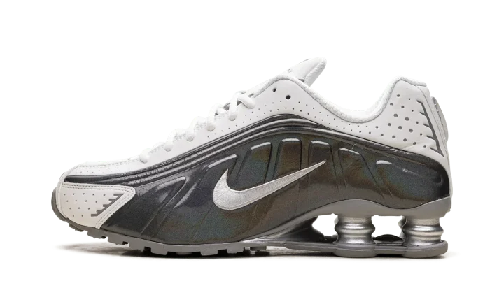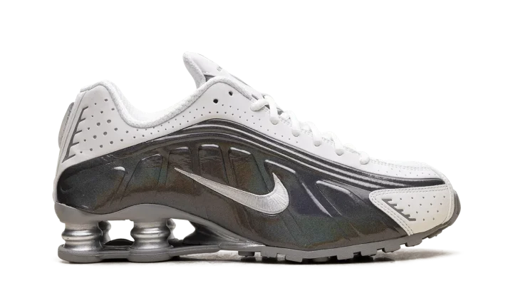 The style code IB7703-100 is for the Nike Shox R4 Women's Shoes (WMNS) in the futuristic, glossy 'Summit White/Hydrangeas/Metallic Silver' colorway. This shoe is a recrafted version of the original Shox R4 icon from 2000, bringing back its signature mechanical cushioning with a modern, eye-catching finish.
