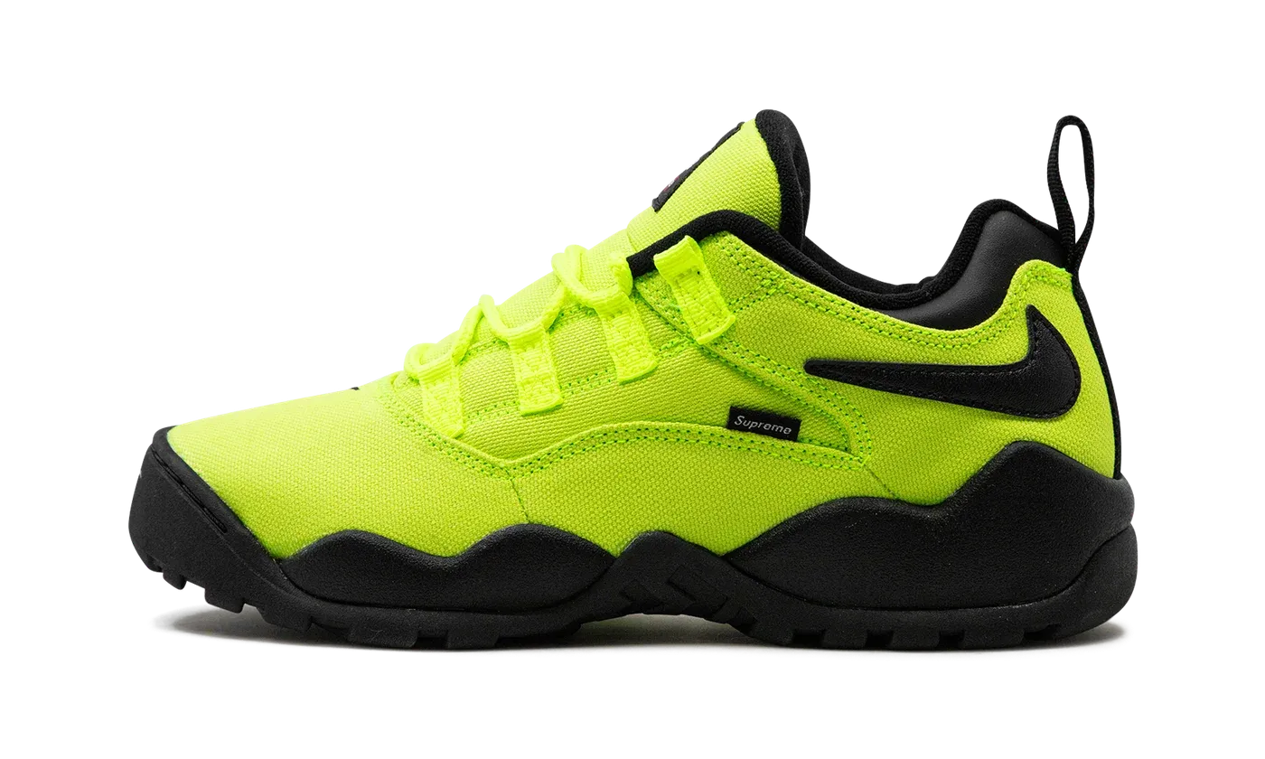 The Supreme x Nike SB Darwin Low "Volt" is a collaboration by the popular streetwear brand on an eye-grabbing, neon green colorway of the retro sneaker. The Nike Darwin was designed by legendary Nike footwear designer Tinker Hatfield and worn by Dennis Rodman in the NBA before it became indoctrinated into the skateboarding world thereafter. Supreme and Nike SB team up to bring back the classic 1990s-era shoe with skate-friendly updates. The "Volt" colorway features a Volt-colored canvas construction with a black reversed Swoosh on the collar. A "Supreme" branded tag is seen on the lateral side of the shoe. Co-branding appears on the tongue.