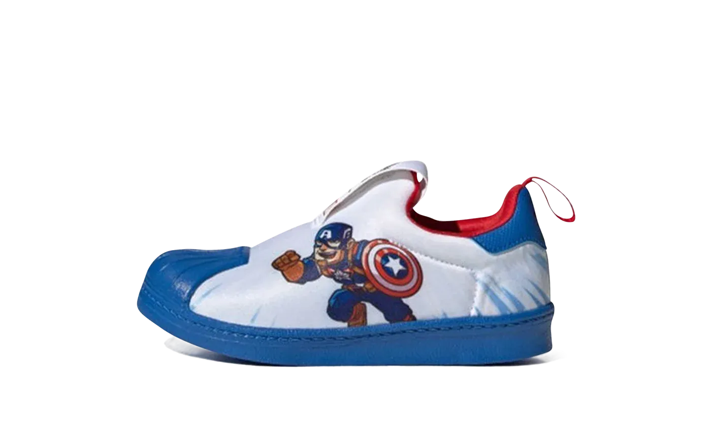 The Adidas X Marvel Superstar 360 SHOES 'Captain America' shoe features a design inspired by the iconic Marvel character Captain America, blending classic Adidas Superstar style with unique superhero details.