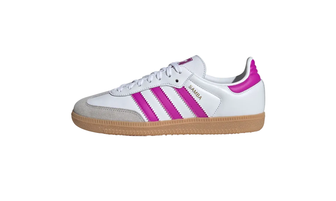 Bring iconic style to the next generation with the ADIDAS Samba OG GS "White Purple". This Grade School edition maintains the legendary indoor football silhouette with a crisp white leather upper and the signature suede T-toe overlay. Playful purple accents on the Three Stripes and heel tab add a vibrant, modern twist to the classic design. It delivers a timeless look and comfortable, durable support perfect for young feet on the go.