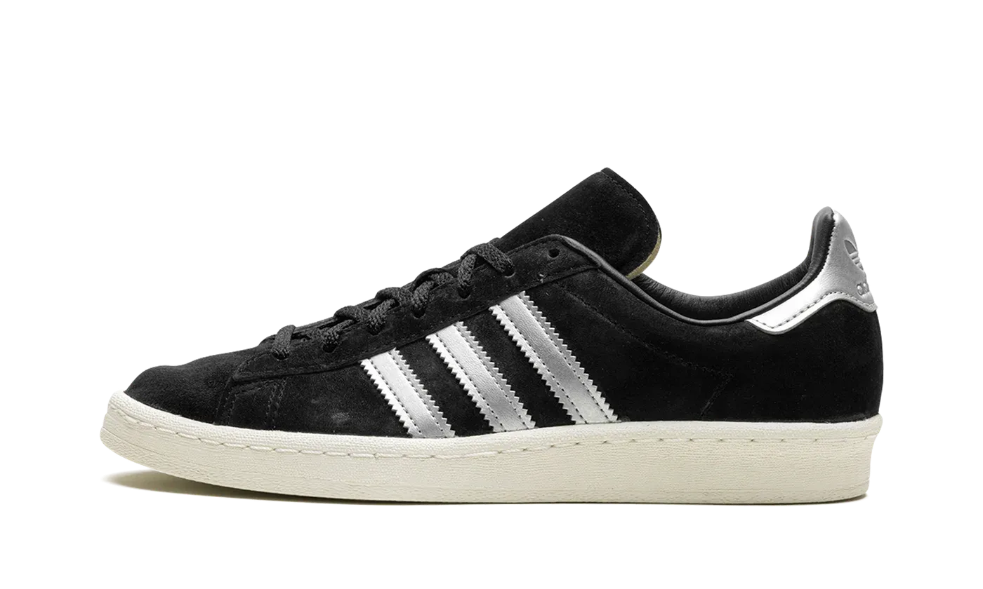 The adidas Campus 80s "Black/Off White" is a two-tone, black-and-white colorway of the retro shoe by the German footwear brand. The adidas Campus 80s in "Black/Off White" is designed in a versatile look for everyday wear. Specifically, the upper has a black suede construction and is contrasted with flashy Metallic Silver leather Three Stripes on the sides. More eye-catching Metallic Silver accenting appears on the heel. A black suede tongue and Off White rubber sole complete the look.