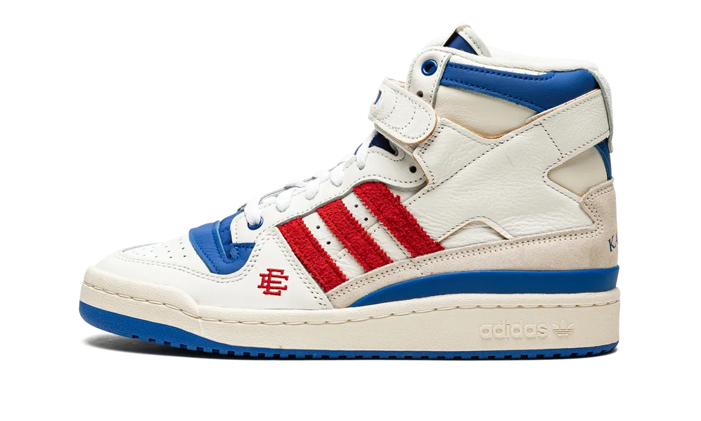 The Eric Emanuel x adias Forum 84 Hi "Kansas Jayhawks" is a collaboration by the New York based fashion designer on the vintage basketball shoe in a colorway dedicated to the Kansas Jayhawks. Emanuel's collaboration on the Forum 84 Hi in the "Kansas Jayhawks" colorway is one of several college basketball makeups of the shoe released in 2021, which includes styles made up in the honor of the Louisville Cardinals and Indiana Hoosiers. The "Kansas Jayhawks" features mostly light cream-colored leather with tonal overlays. A red felt Three Stripes branding appears on the sides. "Kansas" branding in blue is found on the sand-colored suede heel overlay. Additional iconography exclusive to the Kansas Jayhawks college basketball team appears in the form of the school's mascot, Big Jay, on the tongue tag. Release date: December 19, 2021