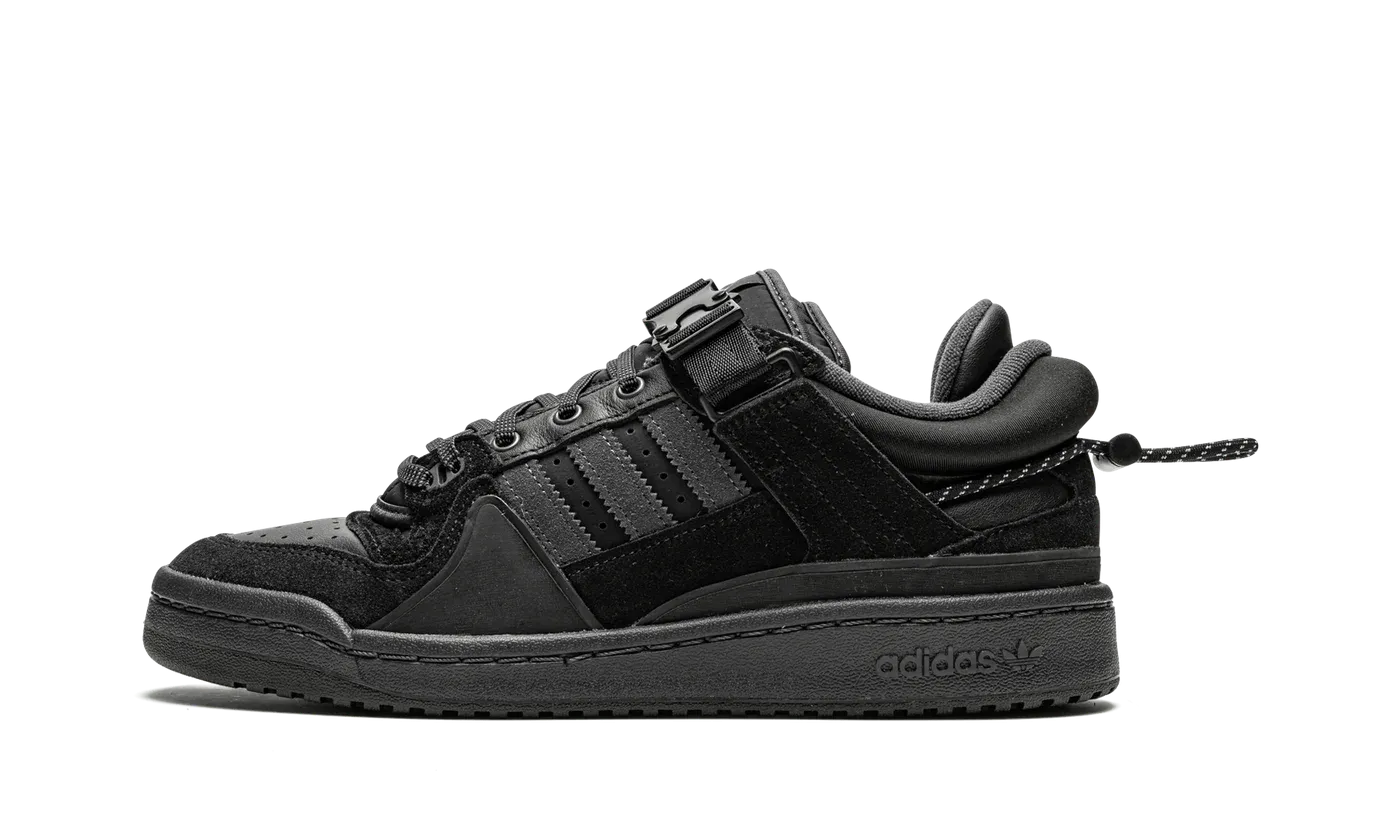x Bad Bunny Forum Buckle Low sneakers from adidas featuring black, suede, signature three-stripe logo, round toe, perforated detailing, front lace-up fastening, buckle-fastening ankle strap, pull-tab at the heel, branded insole and rubber sole. These styles are supplied by a premium sneaker marketplace. Stocking only the most sought-after footwear, they source and curate some of the most hard to find sneakers from around the world..
