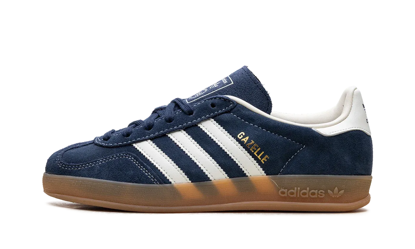 Step into a timeless classic with the adidas Gazelle Indoor "Night Indigo Off White" trainer! This iconic sneaker revives a vintage '70s court shoe, featuring a rich, dark blue Night Indigo suede upper for a premium feel. The classic Off White leather 3-Stripes and heel tab provide a sharp, clean contrast. Grounded by the signature translucent gum rubber outsole, this shoe offers a comfortable fit and a versatile, instantly recognizable retro style perfect for everyday wear.