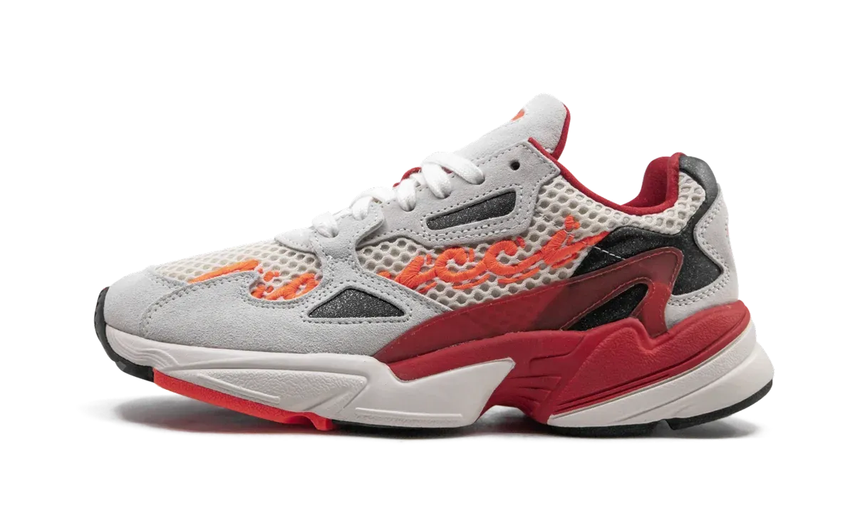 The Fiorucci x adidas Falcon women's shoe is an eccentric collaboration that savors '90s nostalgia. The breathable mesh upper is dressed in milky white with light grey suede and red plastic overlays. Fun and sassy touches include black glitter accents throughout. A signature of the Italian fashion brand is featured along the side in an electric orange hue complemented by an adidas logo found on the tongue tab. A durable Torsion system and rubber outsole add a level of comfort to this unconventional look.