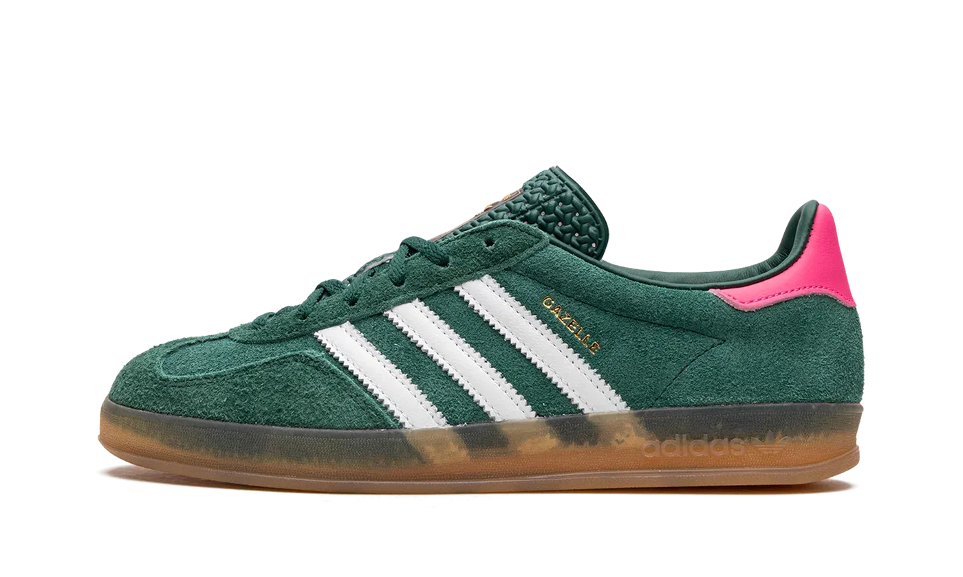 The Women's adidas Gazelle Indoor "Collegiate Green/Lucid Pink" is a women's-exclusive colorway of the retro indoor soccer shoe that turns heads with a green-and-pink design. An eye-grabbing colorway, the Gazelle Indoor in "Collegiate Green/Lucid Pink" features a green suede upper contrasted with white leather Three Stripes detailing on both sides. A gold "Gazelle" logo can be found on the lateral side of the shoe. Lucid Pink leather appears on the heel tab. A classic "adidas" logo is seen on the tongue. Underfoot, a semi-translucent gum rubber sole completes the look.