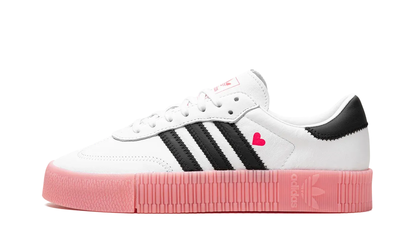 The Women's adidas Sambarose "Valentine" is a women's-exclusive, Valentine's Day-inspired colorway of a modified version of the classic sneaker. The Sambarose updates the Samba's timeless design with an exaggerated, platform-style rubber sole that adds significant height to the shoe. The "Valentine" colorway, as its name suggests, honors the February holiday with special details such as a pink heart on the lateral side of the mid-panel, and pink "adidas" branding on the tongue. As for the rest of the shoe, the upper features a white leather construction with black leather Three Stripes branding on the sides. Various heart details appear on the translucent Glory Pink outsole. Release date: January 18, 2020